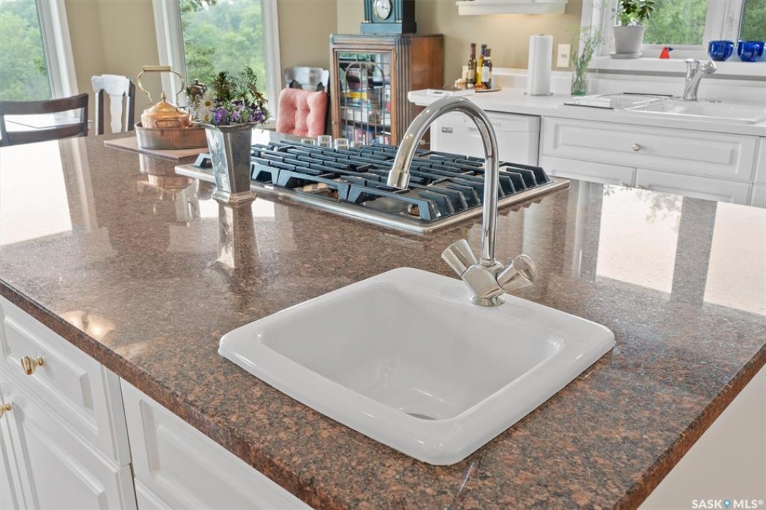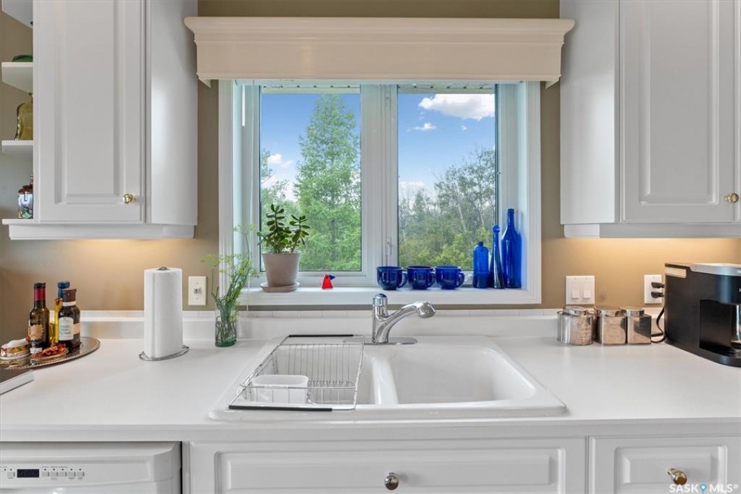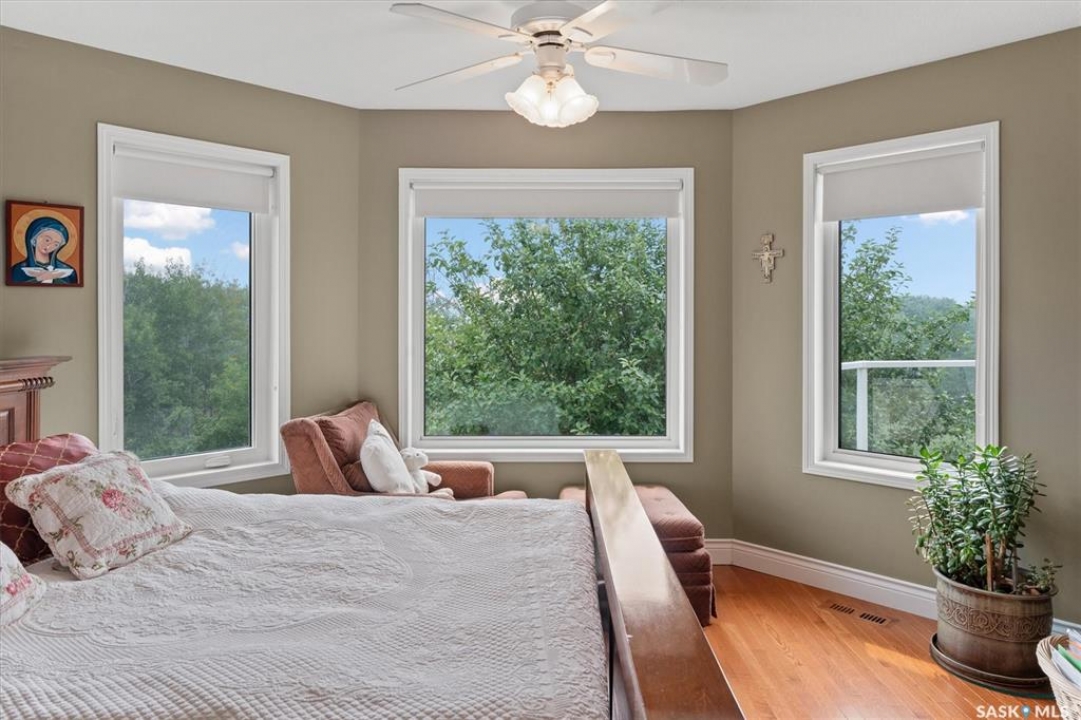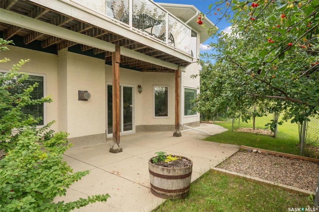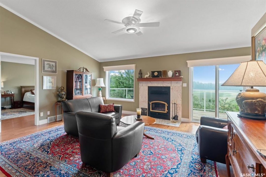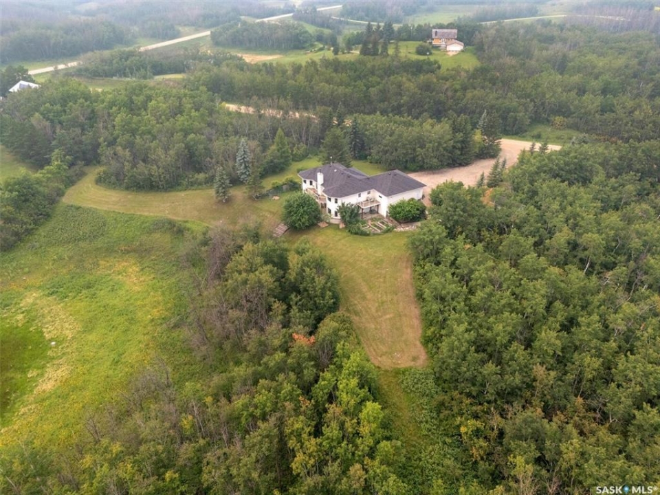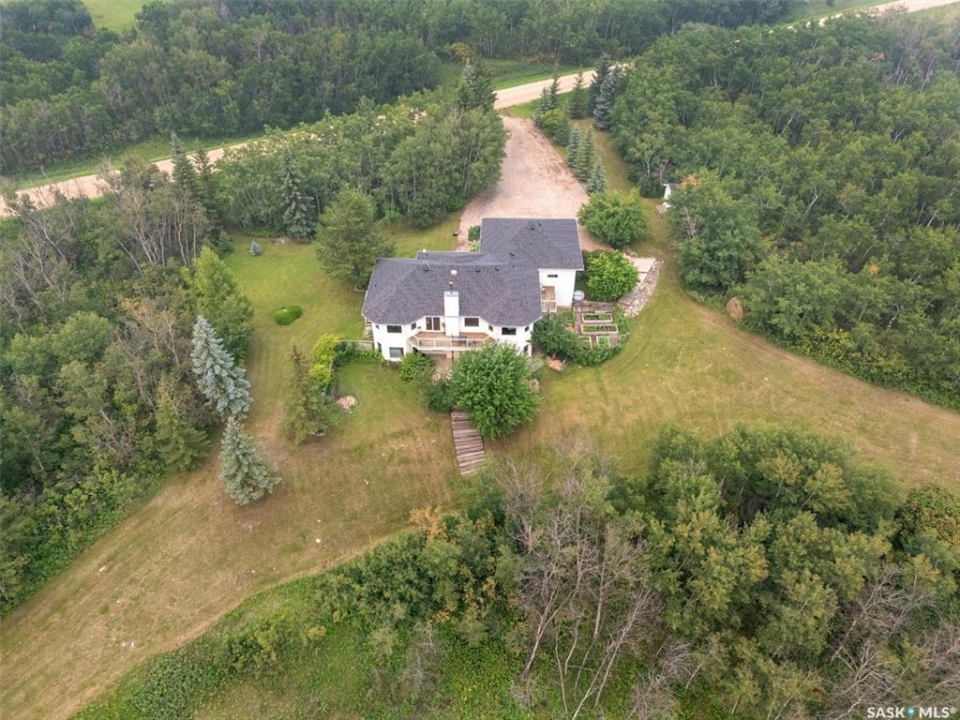 Thoughtfully designed home situated on 10 acres of gently rolling hills. Everything was considered in the design of this sophisticated home, from the southern exposure which takes advantage of the view to the well thought out floor plan. Located only 5 minutes from Saskatoon with pavement almost all the way, this captivating property offers everything you could desire. City water, natural gas, walk out from lower lever and large spacious rooms. Every detail in this home has been considered. Oak hardwood flooring on main level, chef's kitchen with center island and built in appliances. Formal dining room, large master bedroom with en-suite and walk in closet. The lower level is completely developed with family room, 2 large bedrooms, den, utility room plus ample storage. An addition, this home offers both a wood burning fireplace in the living room and a gas fireplace in the lower level family room.