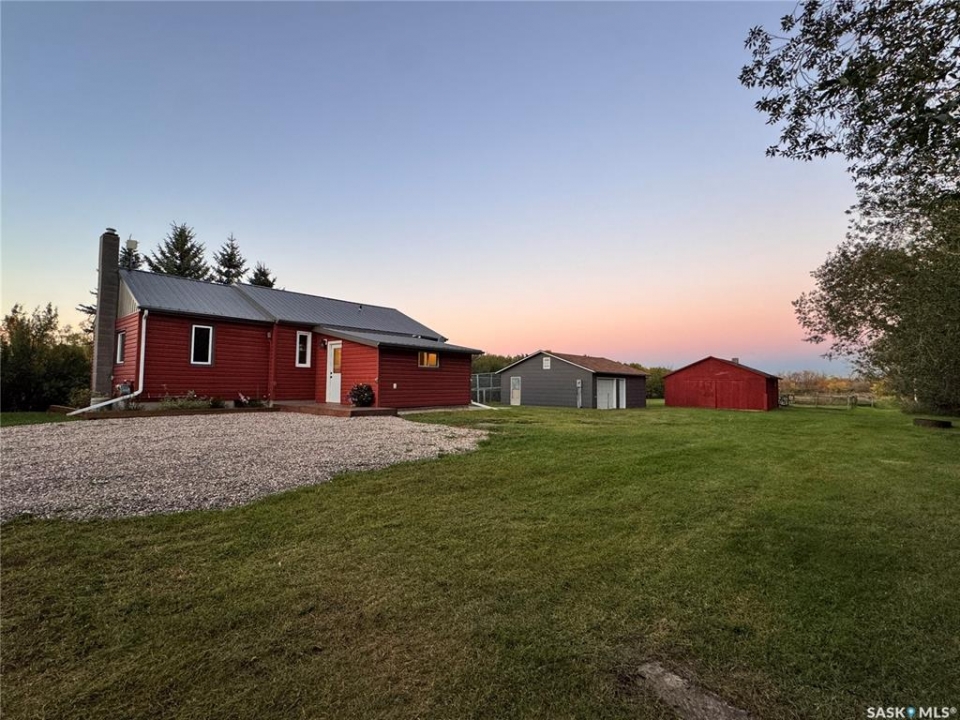 Located only 6km from Osler, tucked into this well treed acreage you will find this 1120sq ft renovated bungalow. If you have been searching for a property close to Saskatoon that can accommodate horses, chickens or you desire more space for hobbies, then this is a great option for you. The property includes a double detached garage, shed, a barn with corrals and pasture land on just under 10 acres. Over recent years 4 bedroom, 2 bathroom home has received quite a facelift with new windows, metal roof, vinyl siding, updated front door and front deck with perennial flower beds(2024). When you enter the home you will immediately notice the spacious front porch with fresh paint, vinyl flooring and space to accommodate everyone in the family and their gear too! The functional kitchen is clean and tidy and has updated appliances. Hosting big family get togethers is no problem with the spacious dining and living rooms with beautiful cottage like views of the property. The main bathroom has been completely renovated and features a beautiful soaker tub with surround, black accessories, vinyl flooring, new toilet, modern vanity, mirror, fan and lighting. The master bedroom is complete with new walk-in closet, vinyl flooring, recessed lighting, 2 windows and fresh paint. The second bedroom has also been similarly upgraded to match and would be perfect for a childs room or office. The basement offers a family room with new carpet and paint, with a newer laundry area located just off of it as well. An entirely new 3 piece bathroom recently developed is an extra bonus. There is 2 additional bedrooms (one of which does not have a closet) to utilize as you wish. This home has been well taken care of and is full of possibilities. Other improvements include newer furnace and water heater updated trim, lighting. With extras like central air conditioning, and city water, this property won't last long. Presentation of offer will be on Wednesday, September 24, 8pm.