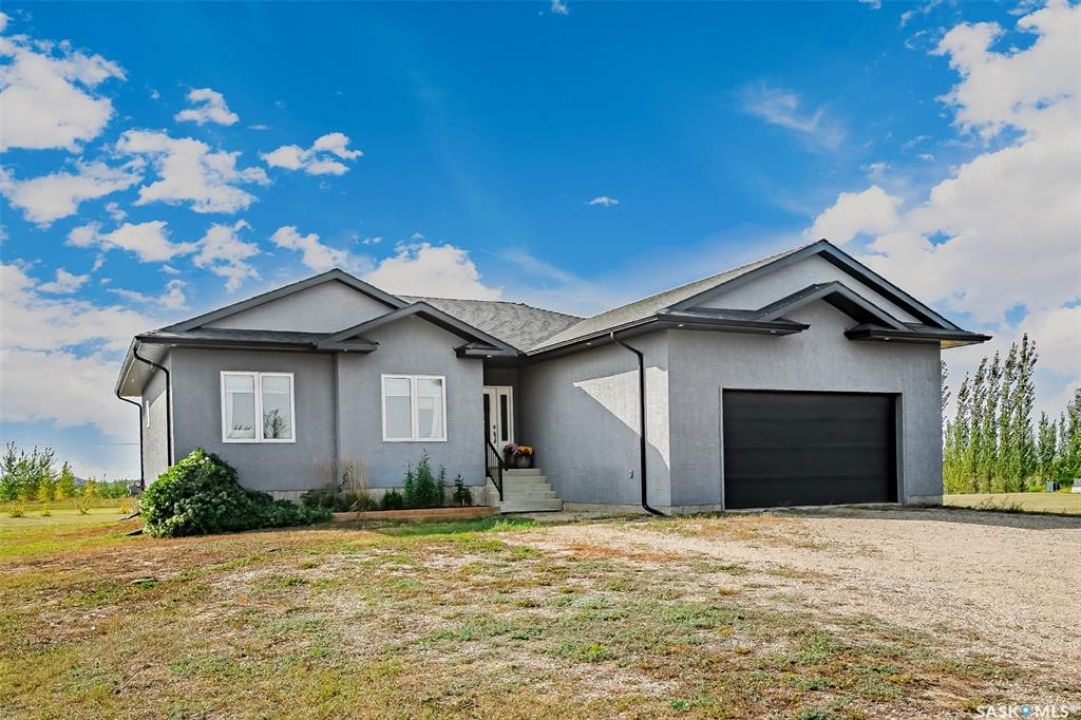 Welcome to this South Country Estates acreage, just 10 minutes south of Saskatoon off HWY 11 in the RM of Dundurn. This 1,348sqft custom bungalow blends modern comfort with country charm. The main floor boasts an open layout with a bright living room, cozy fireplace, and stylish kitchen featuring granite counters, island, and walk-in pantry. The dining area leads to a west-facing deck with gazebo and natural gas hookup—ideal for entertaining. The primary suite includes a walk-in closet and 4-pc ensuite, with two more bedrooms completing the main floor. The basement offers excellent potential, with a family room, games area, 4-pc bath, laundry, den, and 4th bedroom awaiting your finishing touches to the ceiling. A heated 24x26 garage with 8-ft door provides ample storage. Outdoors, enjoy the above-ground pool, play structure, garden beds, and wide-open space. Fibre internet, natural gas, and public water line add convenience, while Clavet School bus pickup is right at the driveway. Perfect for a growing family seeking a peaceful acreage lifestyle with an easy commute to the city.
