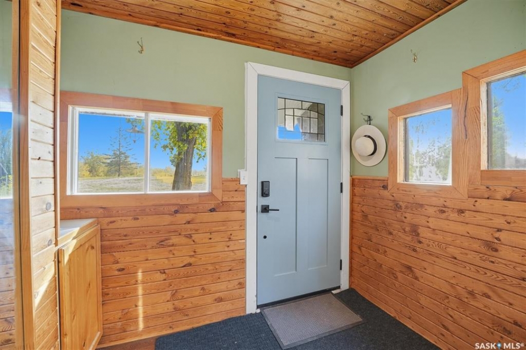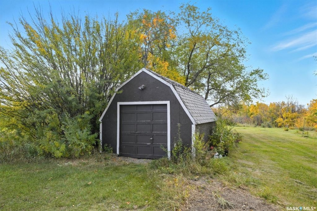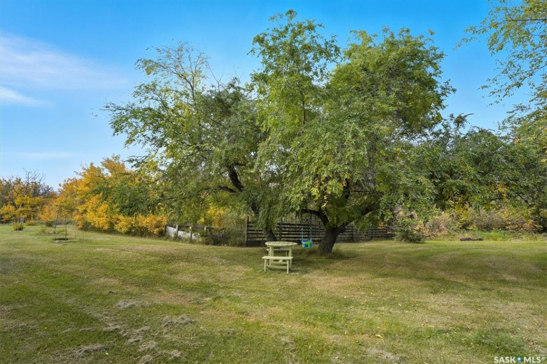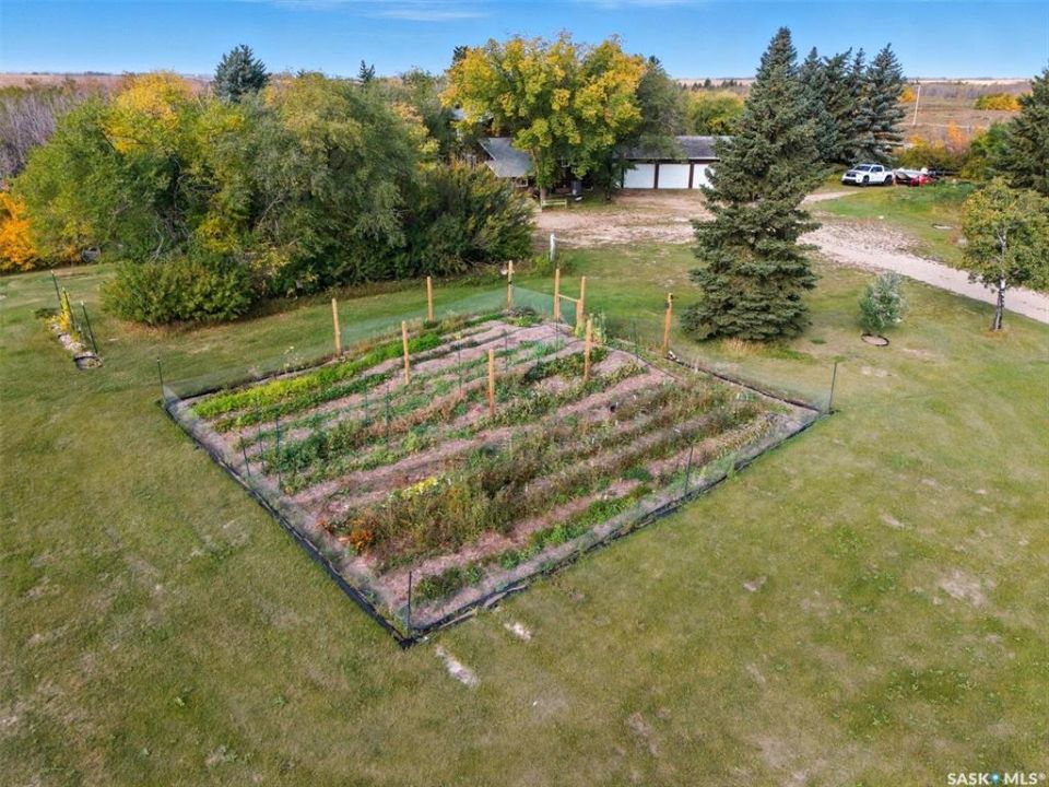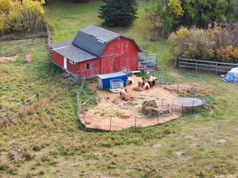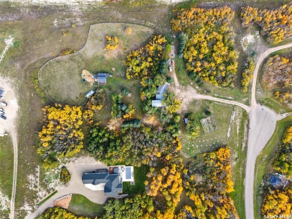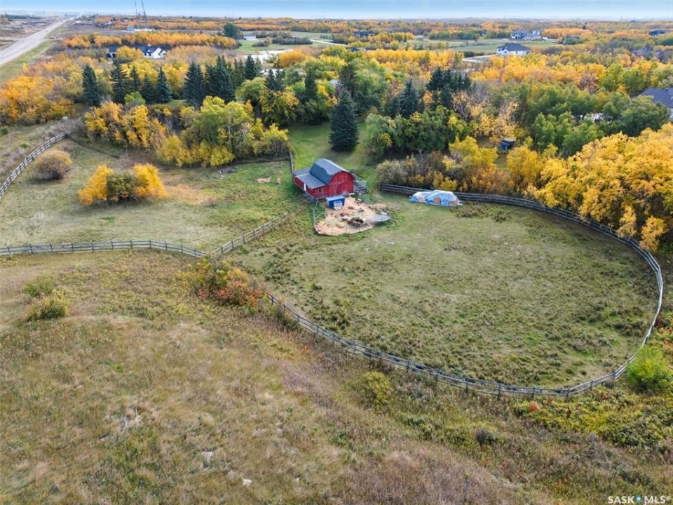 Acreage living just 7 minutes from Saskatoon! Welcome to 203 Spur Way in Saddle Ridge Estates — a charming 1.5-storey home on 4.99 acres in the rolling hills. This 4-bedroom, 2-bath home offers warmth, functionality, and space to grow — inside and out. The main floor features hardwood floors, a spacious kitchen with quartz counters, soft maple cabinetry, and matching appliances. The living room flows to the deck through patio doors, making entertaining a breeze. Cozy up downstairs by the gas fireplace, or retreat to the stunning loft bedroom via the oak spiral staircase, complete with Juliette balcony. Enjoy updated central A/C, windows and front door (all within the last 2 years), and a triple attached garage. The acreage includes a barn with box stall, water, tack room, and loft — perfect for horses, storage, or a studio. Now for the showstopper: a thoughtfully planned food forest with 25+ varieties including apple, plum, cherry, pear, grape, haskap, raspberry, kiwi, seabuckthorn, hazelnut, herbs, strawberries, and even asparagus. Over 70 haskaps, 65 asparagus, and dozens of fruit trees, all mulched, edged, and connected by a line watering system. A fenced 200m � no-till garden produces enough vegetables for full seasonal self-sufficiency. Serviced with city water, septic mound, Fiber Optic internet with Prairie Crocus, school bus access to Clavet, and fully paved development - this property offers a rare blend of rural privacy and urban access. Acreages like this — with natural abundance, modern comfort, and easy commuting — are truly one of a kind.