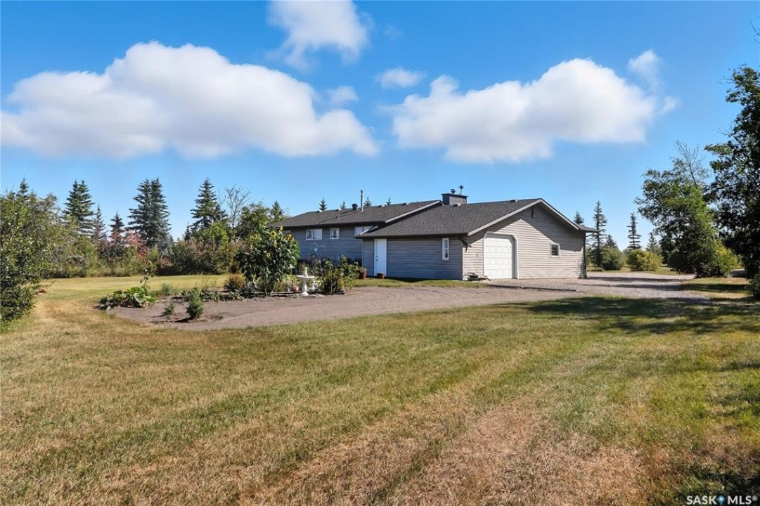 Location, loacation! Only 10 minutes from Saskatoon - this 1392 sq ft raised bungalow is just minutes off Highway 14. Sitting on 10 acres of land that could be easily be subdivided to create revenue and get a return on your investment. Trails wind through the trees and bush, giving you and your family the chance to enjoy dirt biking, quadding, snowmobiling, or even horseback riding right on your own property! The 24'x42' triple car attached garage/shop features 10' ceilings, a spacious work area, and plenty of shelving and storage for tools and toys. Inside the house, you'll feel the character the moment you walk in. The bright living room welcomes you with south-facing windows that flood the space with natural light throughout the day. In winter, the passive solar gain helps keep things cozy, and the wood-burning fireplace adds warmth and charm on a cold winter day. The kitchen is open and functional, with lots of cabinet space and room to host family meals and get-togethers. Just off the kitchen, you'll find a 2-piece guest bath and a convenient main floor laundry room. The main floor also features three big bedrooms and a 3-piece bathroom. Downstairs, the fully developed basement offers two more bedrooms, a large living area, and oversized windows that brighten the space and make you forget that you're in a basement. There's room for a games area, TV room, kids zone, or even a pool table! The property is serviced with natural gas and electricity, and includes a cistern for water that can be easily filled by hauling your own city water, or by delivery. The septic system consists of a concrete holding tank and a grey water pump out. Don't worry about getting the kids to and from school in Saskatoon, because school buses pick up right at the driveway go to elementary, and high schools in Saskatoon! This acreage has had thoughtful upgrades along the way, including newer windows and extra insulation on the exterior walls and in the attic. Book a showing today!