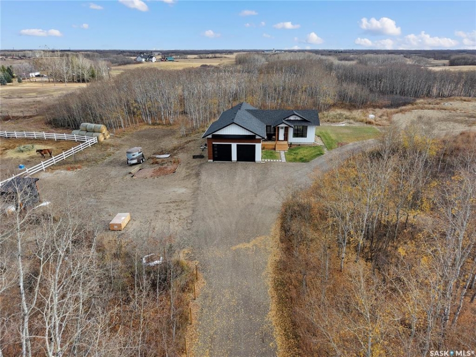 Welcome to this nearly-new acreage just 15 minutes from Saskatoon, offering modern efficiency, natural gas heat, Starlink internet, and horse-ready infrastructure already in place. Surrounded by mature trees and rolling hills. Built in 2024, this 1,353 sq/ft bungalow features an open concept main floor, quality finishes, and a bright, functional layout. 3 bedrooms and 2 bathrooms upstairs. The lower level is wide open and ready for future development, with space for two more bedrooms, a family room, and a bathroom. Plumbing for the bathroom and wet bar is already roughed in. The basement will be framed, insulated and poly'd prior to sale. The oversized 26'x30' attached garage is insulated and provides ample parking, storage and work space. Situated on 5.02 private acres, the yard is partially fenced for horses and includes a tack shed with electricity, horse shelter, automatic watering bowl with room to expand. Properties with horse setup and natural gas are increasingly rare in this price category. Excellent water along with RO drinking water system, reliable road access, and a short commute to the city make everyday living easy. Enjoy quiet country privacy with convenience.