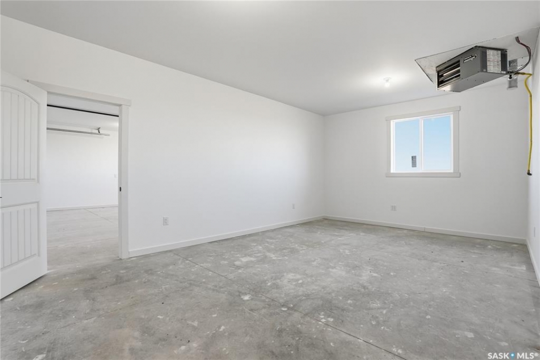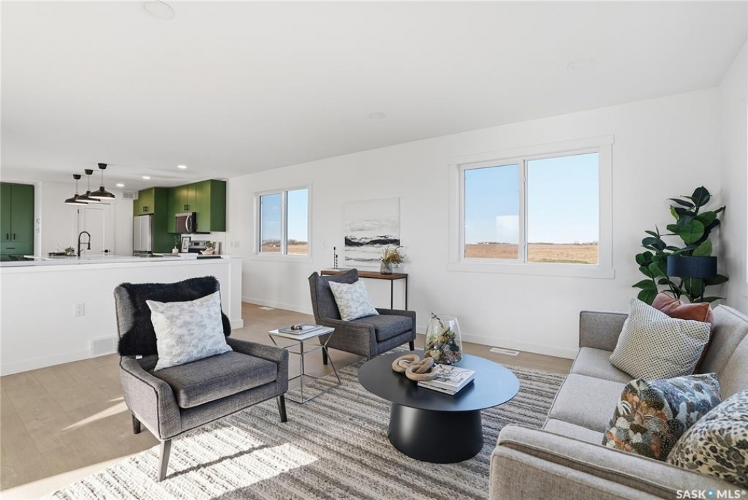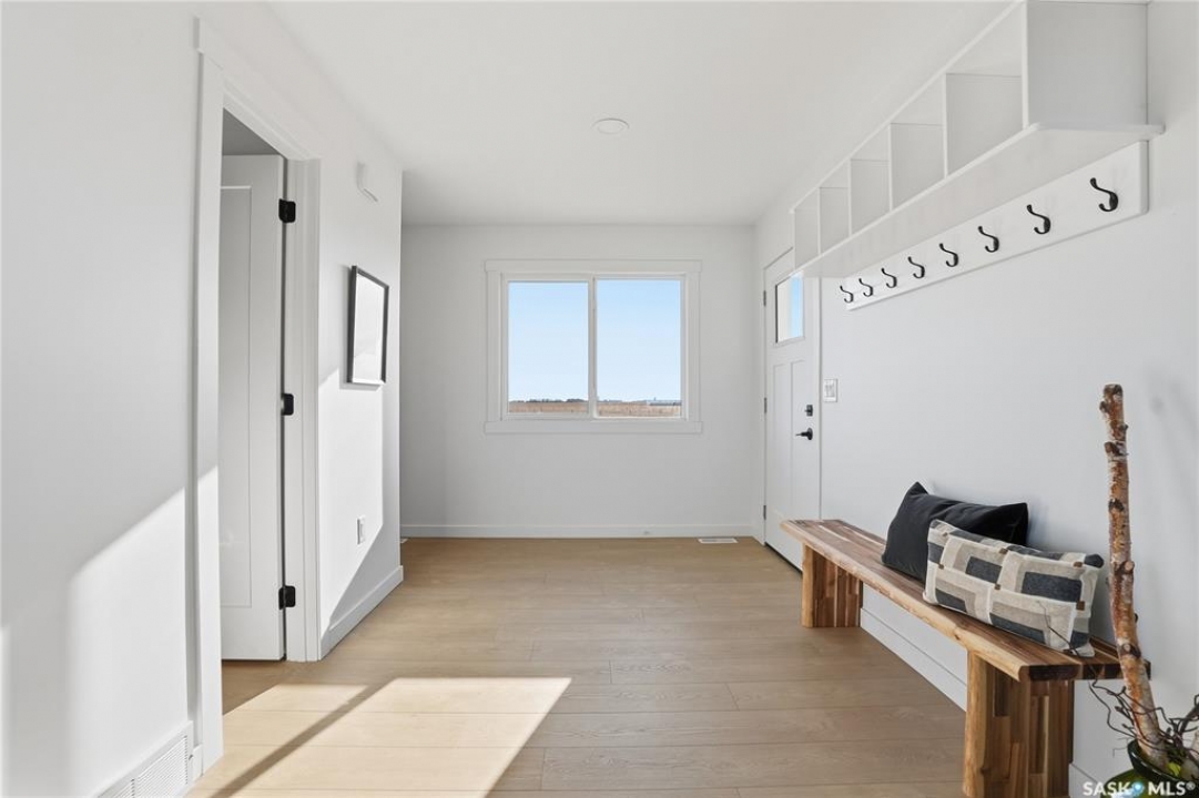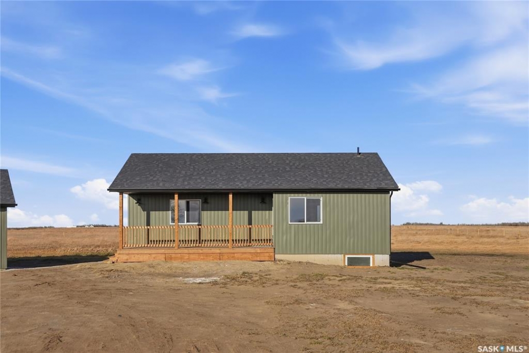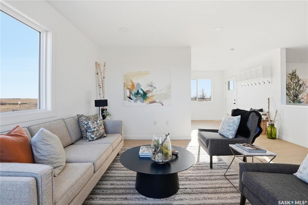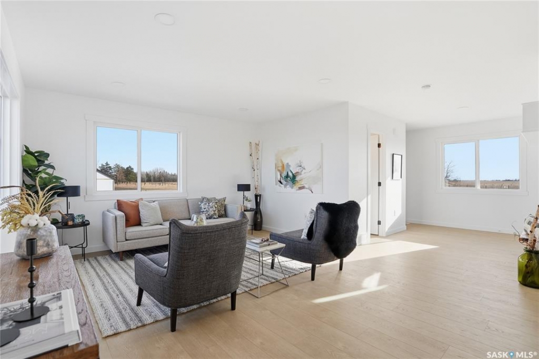 What an Opportunity! Just minutes west of Saskatoon-enjoy peaceful acreage living with city convenience! This newly constructed property sits on 7 acres and offers just over 1,700 sq. ft. of developed space (856 sq. ft. on the main level), featuring 4 beds, two baths, a fully developed basement, and an impressive heated triple detached garage (36' wide with a double overhead door). The home welcomes you home with a charming covered front porch and a functional large foyer complete with a built-in bench and a separate boot room area with floor-to-ceiling wardrobes. The open-concept main floor connects a spacious living room, dining area, and kitchen. The kitchen is a standout, showcasing an abundance of custom lacquer cabinetry, full-height pantry storage, quartz countertops, stainless steel appliances including a microwave hood fan, subway tile backsplash, and an oversized island ideal for large gatherings. The adjacent dining room easily accommodates a large table for the entire family! A convenient two-piece bath completes the main level. An open staircase leads to the bright lower level, which offers four bedrooms (one smaller-ideal as a nursery, office, or den), a spacious family-style 4-piece bathroom, and a large walk-in closet in the primary bedroom. Outside, the detached 36' heated and insulated garage is a dream setup-complete with a workshop area and a double overhead door. The yard is unlandscaped but cleared and ready for your personal design-bring your garden plans and your green thumb. Property is built by a reputable experience Saskatoon builder.
