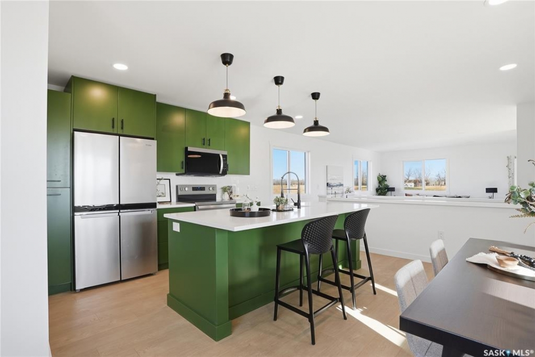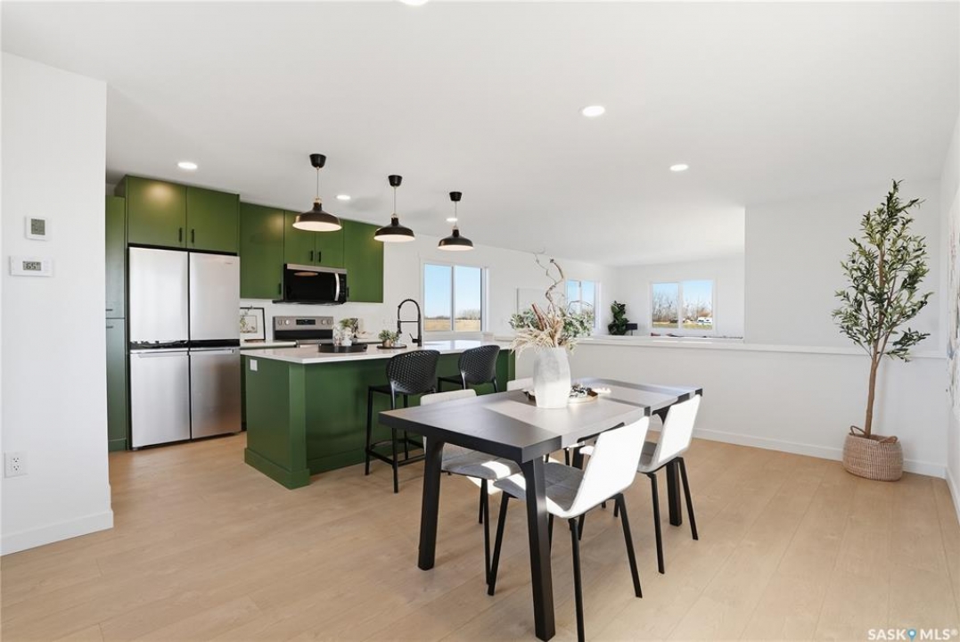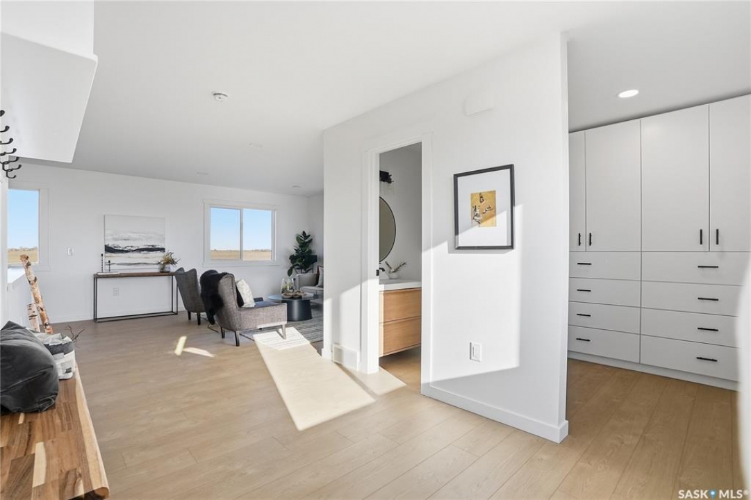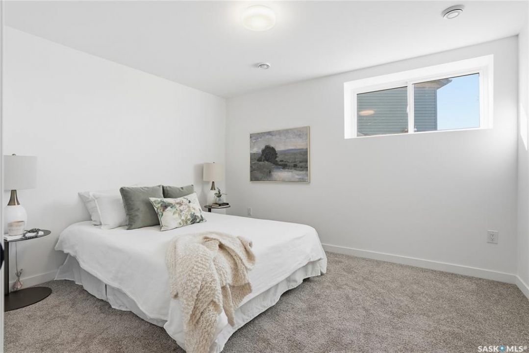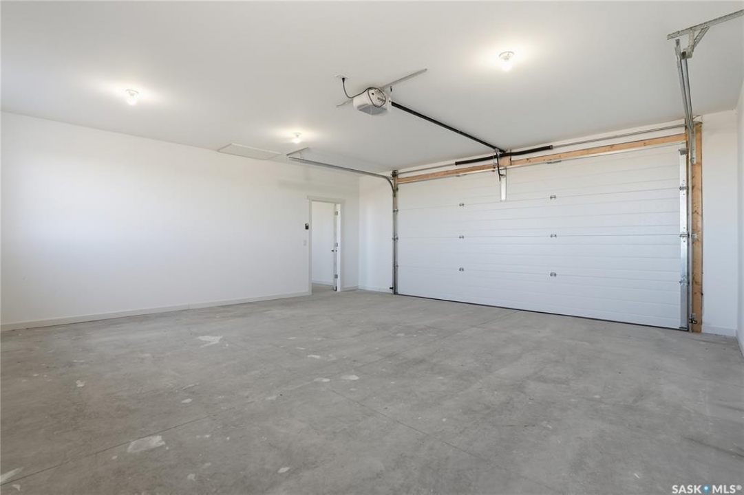 What an Opportunity! Just minutes west of Saskatoon-enjoy peaceful acreage living with city convenience! This newly constructed property sits on 7 acres and offers just over 1,700 sq. ft. of developed space (856 sq. ft. on the main level), featuring 4 beds, two baths, a fully developed basement, and an impressive heated triple detached garage (36' wide with a double overhead door). The home welcomes you home with a charming covered front porch and a functional large foyer complete with a built-in bench and a separate boot room area with floor-to-ceiling wardrobes. The open-concept main floor connects a spacious living room, dining area, and kitchen. The kitchen is a standout, showcasing an abundance of custom lacquer cabinetry, full-height pantry storage, quartz countertops, stainless steel appliances including a microwave hood fan, subway tile backsplash, and an oversized island ideal for large gatherings. The adjacent dining room easily accommodates a large table for the entire family! A convenient two-piece bath completes the main level. An open staircase leads to the bright lower level, which offers four bedrooms (one smaller-ideal as a nursery, office, or den), a spacious family-style 4-piece bathroom, and a large walk-in closet in the primary bedroom. Outside, the detached 36' heated and insulated garage is a dream setup-complete with a workshop area and a double overhead door. The yard is unlandscaped but cleared and ready for your personal design-bring your garden plans and your green thumb. Property is built by a reputable experience Saskatoon builder.