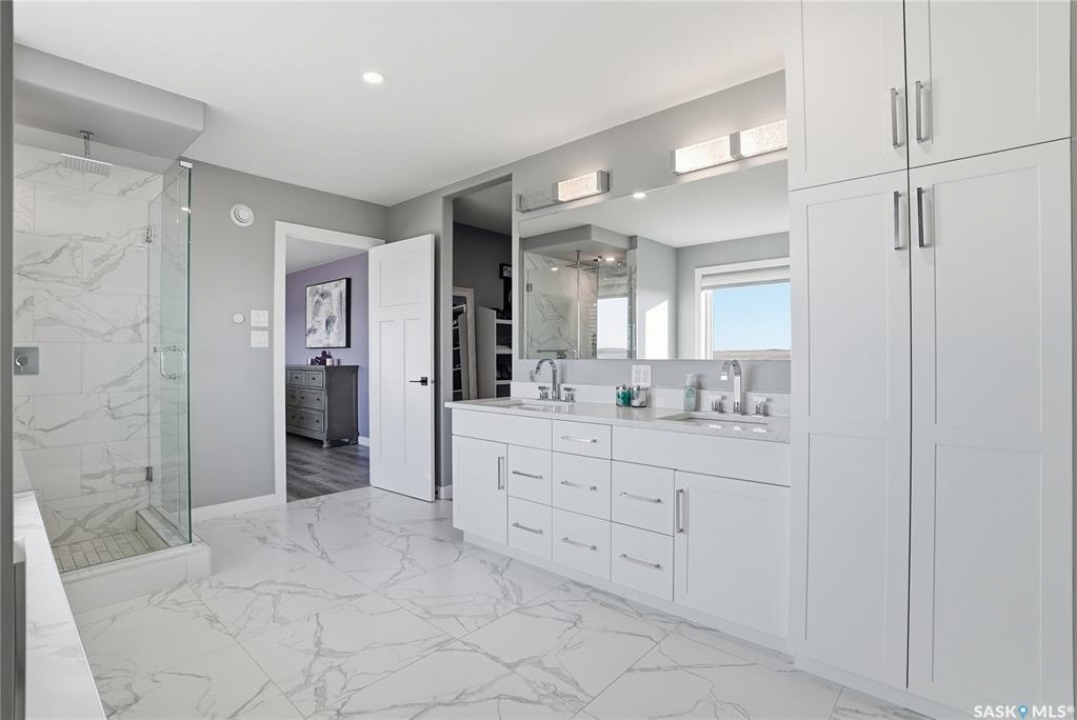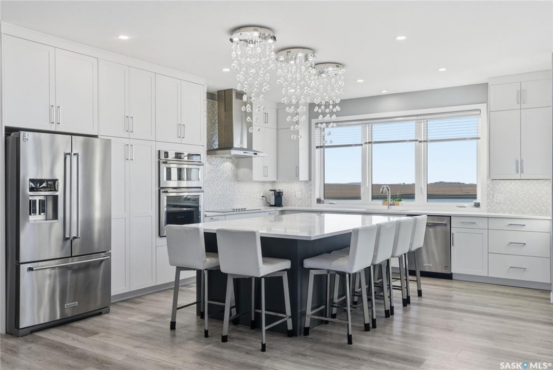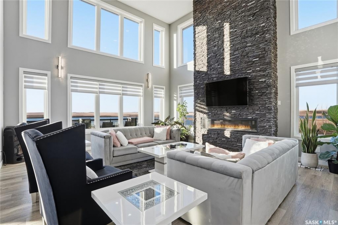 Located 30 minutes east of Saskatoon, this exceptional 2021 custom-built two-storey home spans over 3,700 sq. ft. above grade with a fully finished walkout basement, perfectly positioned to capture sweeping views of rolling hills and endless sunsets. The main floor's open-concept design showcases a chef-inspired kitchen, elegant dining area, and a grand great room with a striking gas fireplace framed by expansive windows. A spacious mudroom seamlessly connects to the heated 3-car garage, complemented by an additional single garage. The main level also features a private office, laundry, and powder room. Upstairs, discover an impressive bonus room and a luxurious primary bedroom complete with a spa-style 5-piece ensuite and a walk-in closet designed to impress, plus two additional bedrooms and a 4-piece bath. The walkout level extends the living space with two more bedrooms, a full bath, a family room with a gas fireplace and wet bar, and a fitness room. With city water, dual furnaces and A/C units, in-floor heat in the garage and basement, a mature shelterbelt, and absolute peace and privacy, this remarkable property redefines country luxury. You'll want to see this incredible property for yourself!