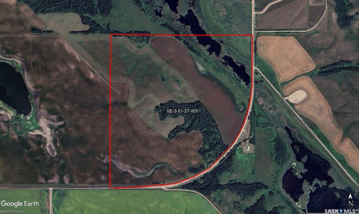 Lloydminster 150 acres Grain Farmland (Limin) Legal Land Description: SE 3-51-27 W3 Surface Parcel: 130573920 RM: Britannia No. 502 Property Description Prime location just minutes from Lloydminster! Situated only 4 miles north and 4.5 miles east of the city, this 150-acre parcel offers an excellent blend of convenience, productivity, and investment potential. Access is superb via Township Road 510, which borders the south and east sides and curves around the southeast corner for easy year-round entry. The property features productive Waseca loam to light loam soils in the Black soil zone, with a weighted average soil final rating of 61.7. According to SAMA, approximately 69 cultivated/arable acres are higher-quality loam (rating ~69), and another 28 cultivated/arable acres are level, lower-lying ground (rating ~57). It is estimated that approximately 42 arable acres currently in hay (and some of the pasture acres) could be converted back to grain production. The balance includes approximately 26 acres of pasture and 21 acres of bush/wetland, adding ecological and aesthetic diversity. An inactive surface lease with Cenovus provides approximately $2,200 annually in supplementary income. SAMA Information 144 total acres 55 cultivated acres 42 arable hay/grass acres 26 pasture acres (some are arable) 21 wetland/bush acres $285,600 total 2025 assessed value (AV) $317,333 average assessment per 160 acres 61.7 soil final rating (weighted average) $650,000 Farmland Price $4,329 per title acre (ISC) 2.28 times the 2025 assessed value (P/AV multiple) Driving Directions: Travel north of Lloydminster on Hwy #17 (approx. 6.6 km), then east on Township Rd 510 for ~6.8 km. Property is located on the north (left) side of the road.