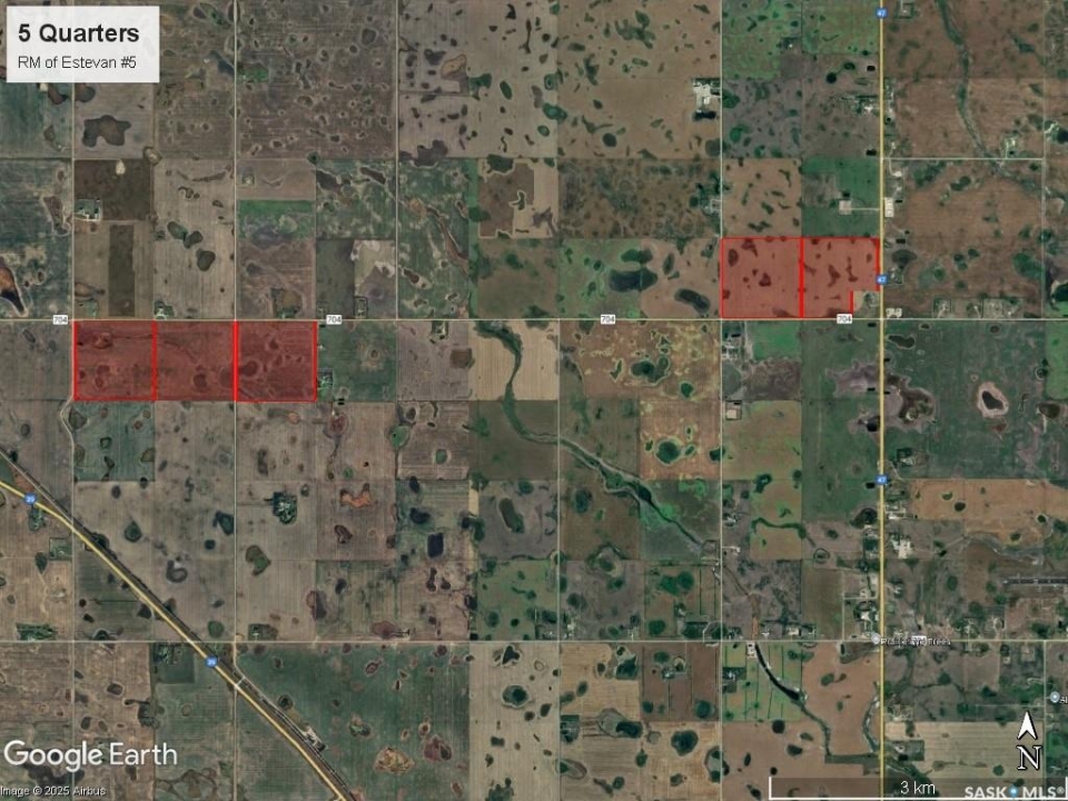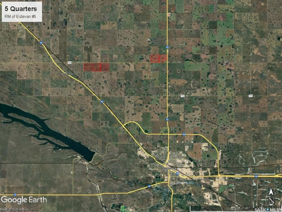 An exceptional opportunity to acquire 765 acres of highly productive farmland ideally located just outside the city of Estevan, Saskatchewan in the RM of Estevan #5. This land offers excellent accessibility and exposure along the 704 Grid, strategically positioned between Highways 47 and 39, with frontage along Highway 47. All five parcels have three phase power lines along the perimeters. The property is divided into two main blocks. Block 1: 473 contiguous acres running east–west, including a half section that can be farmed as a single field, with a grid road separating the third quarter. Block 2: 292 contiguous acres situated at the junction of Highway 47 and the 704 Grid. The acreage in the southeast corner of the SE 27-3-8 W2 is not owned by the seller and is not included. Land Details: According to SAMA Field Sheets, the land features approximately 663 cultivated acres with a soil final rating weighted average of 52.08. Topography is rated T1 (level to nearly level) and stones S2 (slight). Saskatchewan Crop Insurance classifications include three “H” quarters and two “J” quarters, reflecting strong productive capacity across the farm. Occupancy: The land is available to be farmed by the Buyer for the 2026 crop year, with no right of refusal in place. Sale Structure: Four quarters are being sold by way of share sale (NW 24-3-9 W2, NE 24-3-9 W2, NW 19-3-8 W2, Pt SE 27-3-8 W2 Ext 1), while one quarter will be sold by title transfer (SW 27-3-8 W2). While the owners preference is for the sale of shares for the four quarters they will also consider offers for the titles (non-share sale).