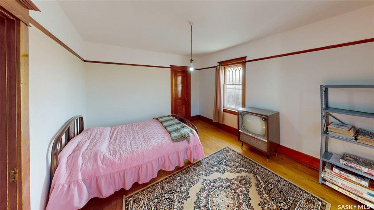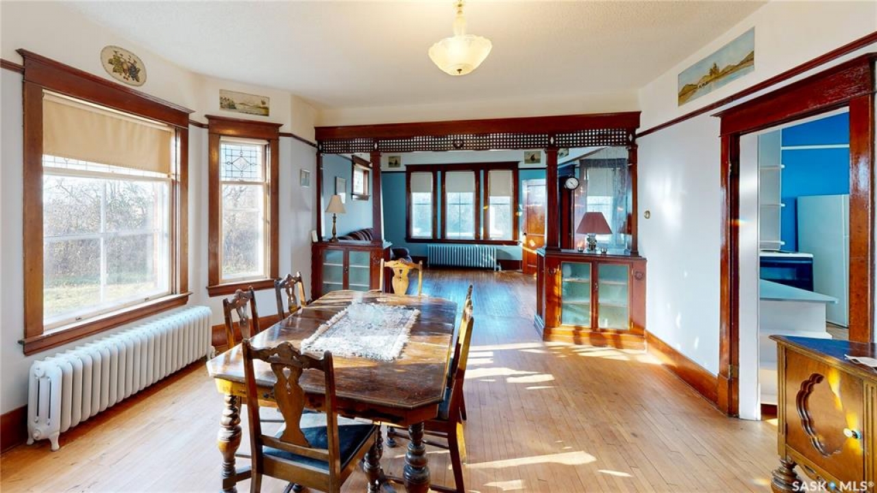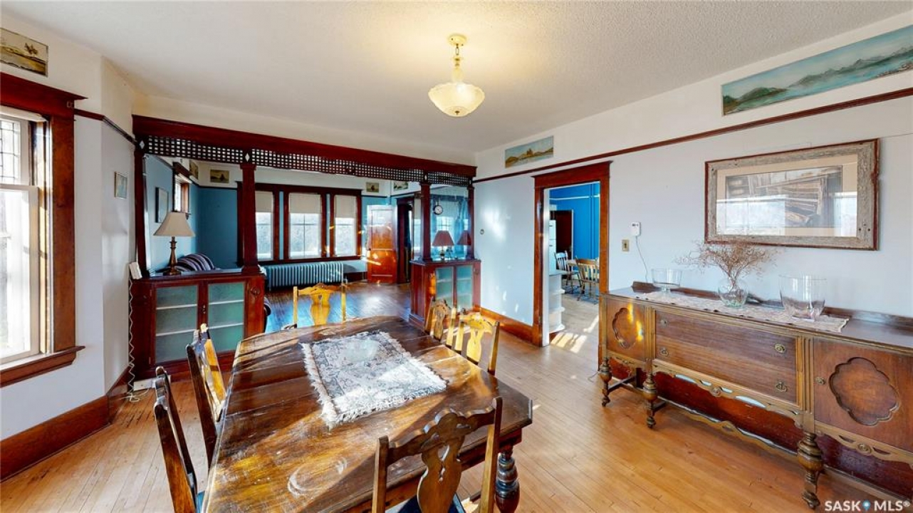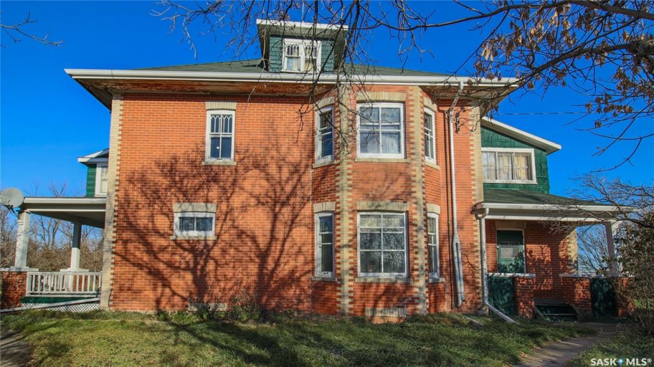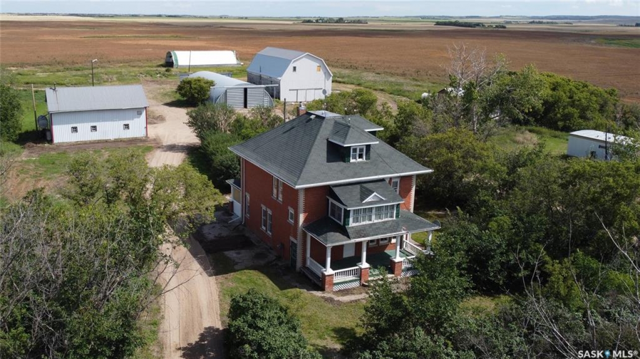 Welcome to the beautiful and historic Hamilton House acreage in the scenic Last Mountain Valley. This 1918 built, 2032 square foot, 5 bedroom 2 bathroom, 2 storey, brick farm house exudes timeless character and sits on a massive 12.56 acres of land close to the town of Cymric Saskatchewan. Steeped in heritage and surrounded by prairie serenity, the property also includes an impressive collection of outbuildings. A 38 x 58 2 storey barn, a 40 x 80 quonset with electricity, and a 28 x 40 heated shop with electricity. You enter this home into the porch that has plenty of room for your outdoor wear. The spacious kitchen has room for a table and chairs or a future island. With the right vision this space has the potential to be the dream kitchen you've always wanted. The fridge and stove are included. To the side is a 4 piece bathroom. The living room is bright with multiple windows, original hardwood flooring flows throughout the home and stunning hand painted murals line the top of the walls. Adjacent to the living room is the formal dining room, perfectly sized to host large family gatherings and holiday dinners with ease. Finishing off the main floor is the first bedroom that also makes a great home office. Upstairs on the second floor you'll find 4 more great sized bedrooms. All with their own unique charm and personality. A handy two piece bathroom is also on this level. Even more potential awaits in the huge attic, which could be transformed into a spectacular primary suite, studio, playroom, or cozy loft lounge. The possibilities are endless. The home also includes a full unfinished basement, housing the owned furnace, an electric water heater, and a backup electric furnace. With its captivating history, expansive land, charming character details, and incredible opportunity for customization, the Hamilton House acreage is the perfect canvas for your dream rural lifestyle. This is your chance to create something truly special to enjoy for generations to come.