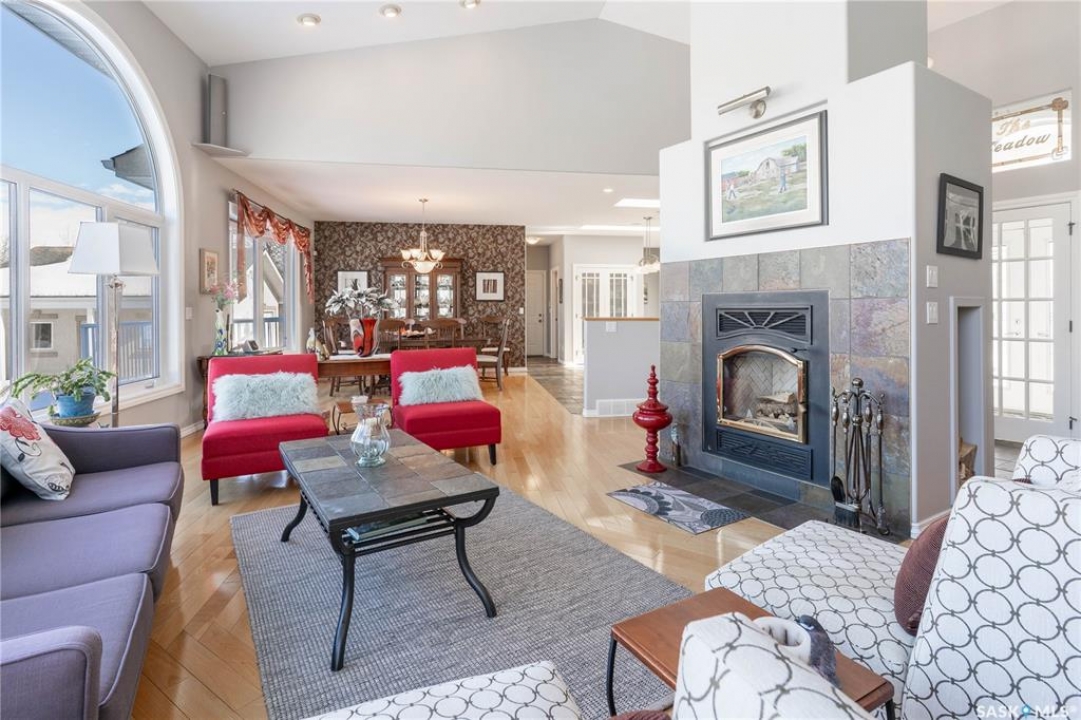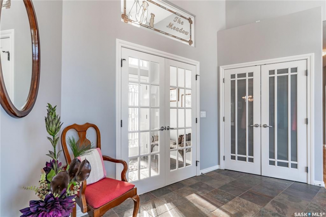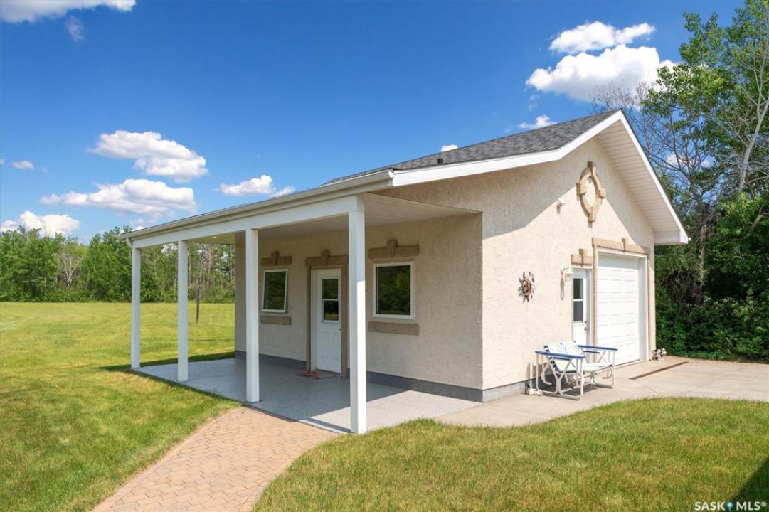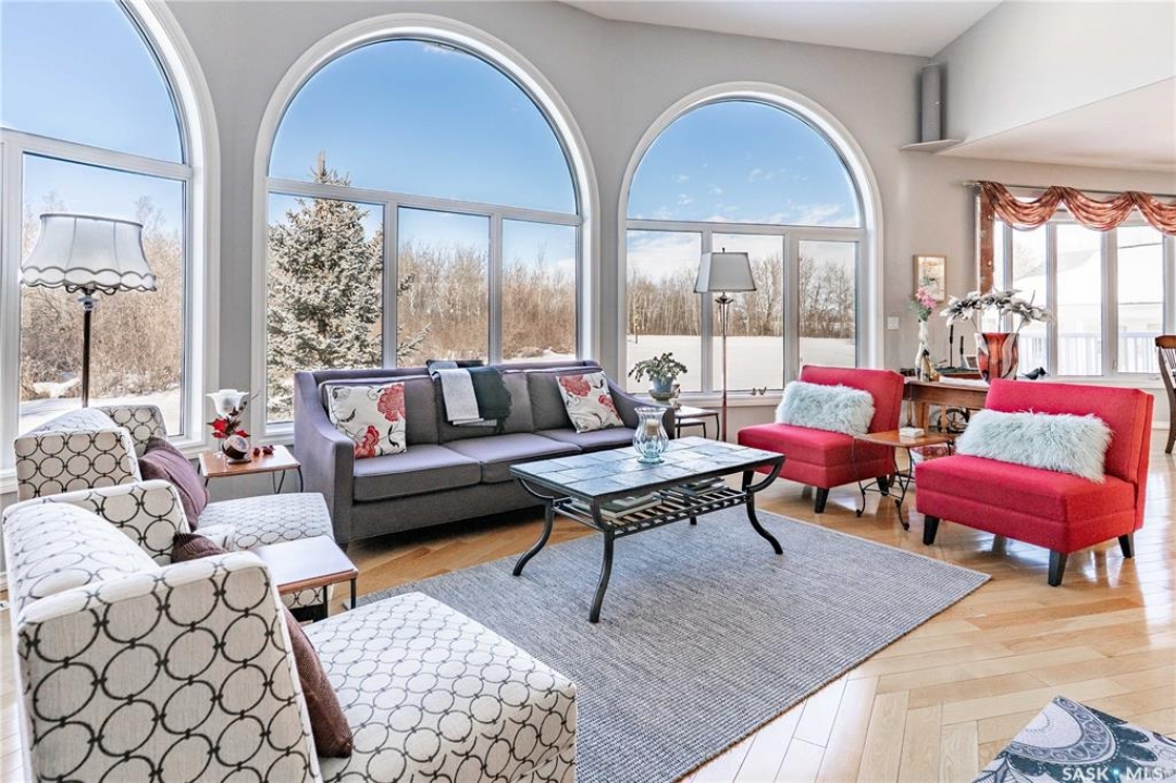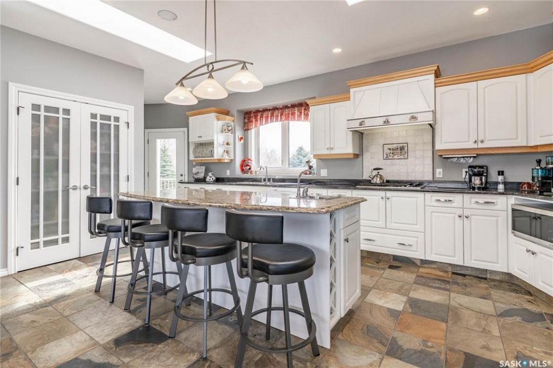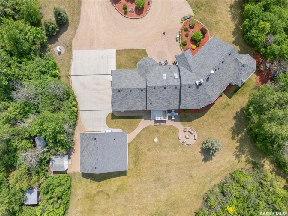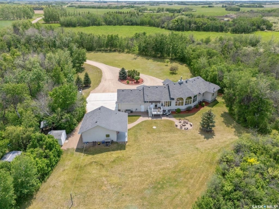 Welcome to The Meadow, 80 acres of pure serenity on the southeast doorstep of Saskatoon. This peaceful paradise offers the privacy and tranquility of country living, just minutes from Costco and Greenbryre Golf & Country Club. This sprawling, custom-built Ehrenburg bungalow is designed for comfort, beauty, and connection to the nature. The grand front entry welcomes you with soaring vaulted ceilings and a sweeping sense of space. The centerpiece of the great room is a stunning wood-burning fireplace, creating a warm, inviting atmosphere enhanced by floor-to-ceiling windows that frame breathtaking views of the wilderness waiting for you out your back door. White oak hardwood gleams throughout the main floor, paired with slate tile in the foyer and kitchen. The spacious kitchen features a large 8-foot granite island, gas stove, built in oven, ample cupboard space, and easy flow into a turret-shaped sun porch—perfect for morning coffee or sunny, lazy afternoons. This south-facing gem is flooded with natural light and designed to make the most of every season. The main floor also includes laundry, three well-appointed bathrooms, and three bedrooms. The primary bedroom offers a peaceful retreat, complete with a three-piece ensuite and a private turret-shaped sunroom for year-round quiet moments of rest and reflection. Additional features include a heated double attached garage and a wide single detached garage with shower and bathroom facilities—an ideal workshop with ample space for storage and tons of room for any project. The full basement is ready for your custom development, with in-floor heating lines already roughed in. Whether you're looking to raise a family, escape the city, or simply enjoy life in harmony with nature, The Meadow delivers the best of all worlds—privacy, space, and proximity to everything you need. Must be experienced to be fully appreciated. Call your favourite Realtor � to arrange a private viewing today!