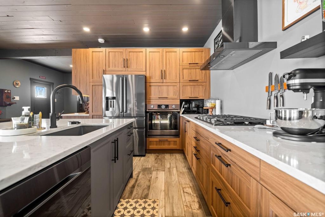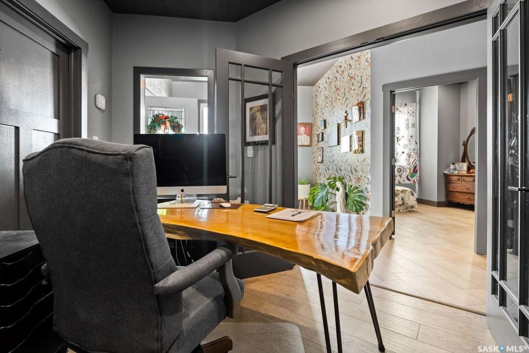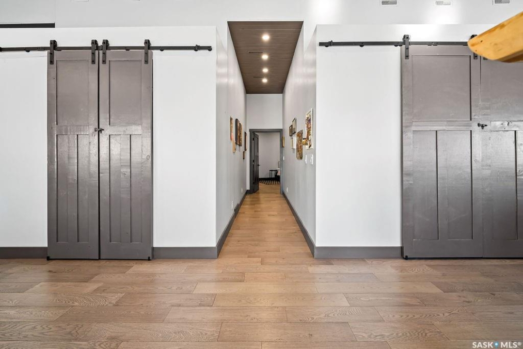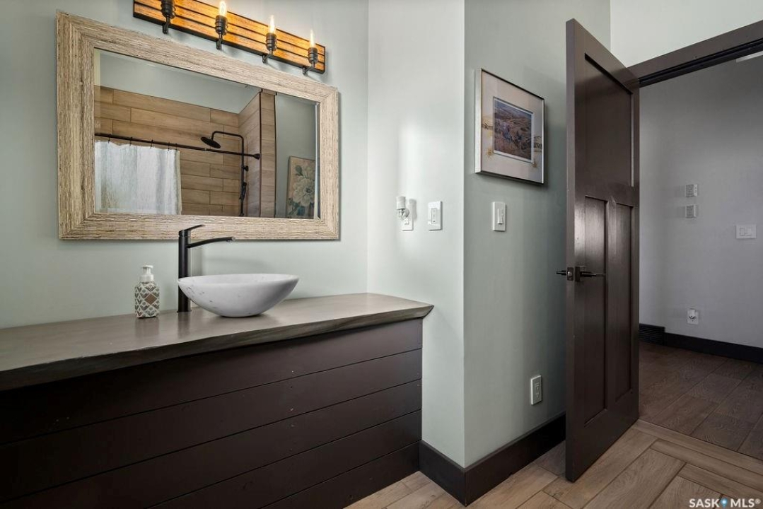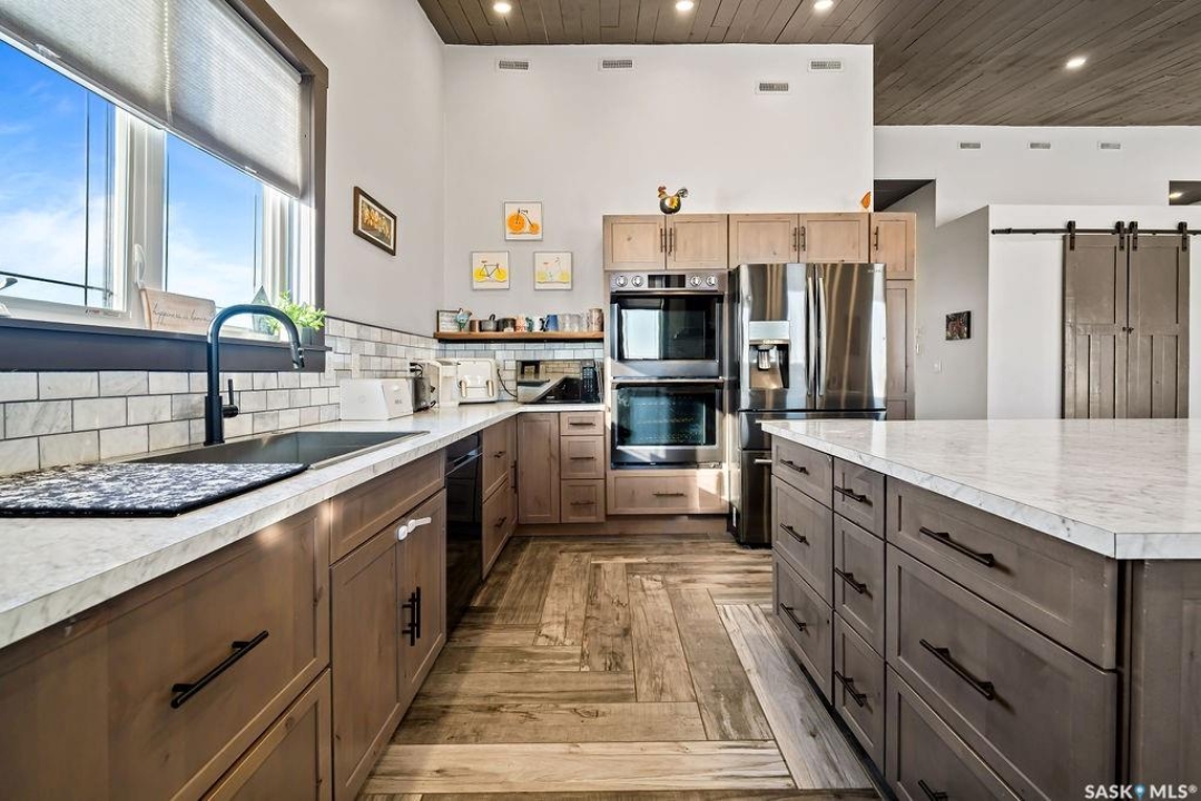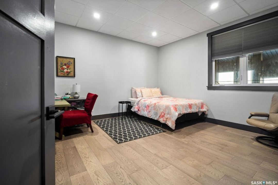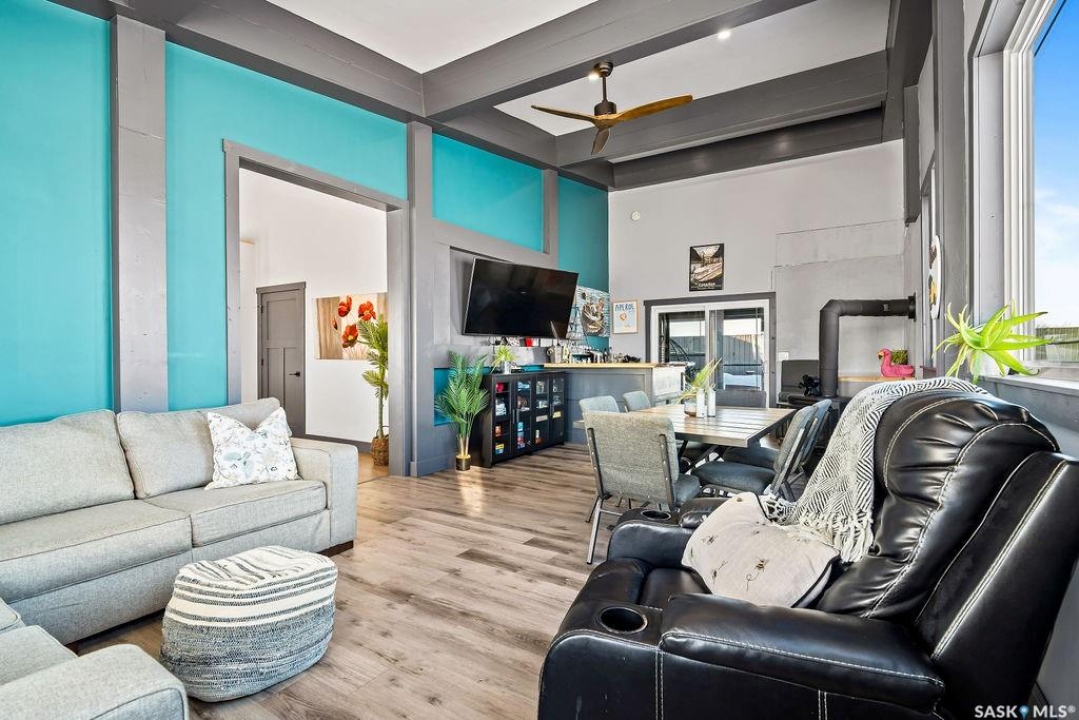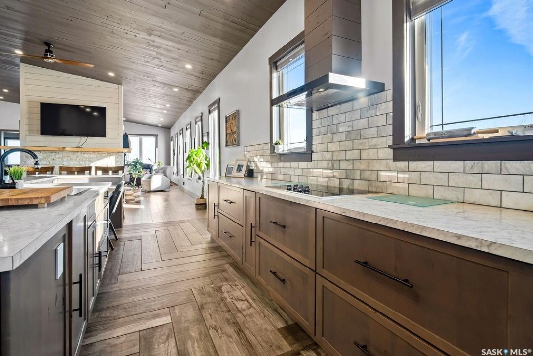 One-of-a-kind acreage located just 15 minutes from Estevan and 10 minutes from Lampman, offering exceptional space, versatility, and lifestyle potential on a beautifully maintained 5.10-acre parcel in the RM of Benson No. 35. This impressive 2016-built bungalow offers approximately 5,400 sq. ft. of thoughtfully designed living space and features two separate living quarters, ideal for multi-generational families or guest accommodation. The home includes 6 bedrooms, 4 bathrooms (an addtional bathroom in the shop), multiple living areas, and dedicated office space, with both primary bedrooms showcasing full en suite bathrooms finished with tiled flooring and tiled tub and shower surrounds. Quality interior finishes include engineered hardwood throughout the main living areas, tile in kitchens and bathrooms, custom wood moldings, and stylish lighting, while high vaulted ceilings and large windows flood the home with natural light. Each living room features a fireplace, including a striking double-sided fireplace shared with a massive chef's kitchen designed for everyday living and entertaining. Additional spaces include a bright bar and games room surrounded by windows and a closed-in hot tub room overlooking the landscaped yard. Comfort features include in-floor heat, central air conditioning, and air exchange. The attached heated 5,500 sq. ft. shop is divided into three bays with overhead door access, offering excellent flexibility for personal or commercial use. The bay connected to the home includes an additional bathroom, laundry hookups, and a commercial-grade exhaust fan. The yard is fully manicured with multiple sprinkler zones supplied by the well and programmable from your phone. A detached outbuilding with concrete floor and tin siding, currently used as a chicken coop, adds further versatility. Zoned AG/RES/COMM, this rare acreage offers outstanding residential comfort with exceptional shop space close to both communities.