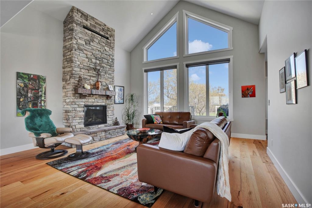 This beautiful, private acreage features 5 bedrooms, 4 bathrooms, a triple-car attached garage, and multiple outbuildings. Located just 22 minutes from Saskatoon, this acreage sits just outside the town of Delisle which features all amenities such as schools, grocery, gas, recreational activities and more. This 2020 built bungalow was customized with high building standards. The veranda at the front of the home provides entry into both the dining room and front hall. The spacious front entry gives access to the triple attached heated and insulated garage, half bathroom and main floor laundry room. The kitchen offers a large island, custom soft closet cabinets and drawers, glass tiled backsplash, quartzite countertops, large pantry and Jenn Air appliances. The kitchen is open to the family room with vaulted ceilings, a propane fireplace and large windows providing both a scenic view and an abundance of natural light. The sun room is fully insulated and can be used year round with a space heater or by leaving the doors open to the main living space. The great room boats 18ft ceilings and a second propane fireplace. Down the hall are three bedrooms including the master suite and the main bathroom. The master offers a walk in closet, five-piece ensuite with a water-air tub, separate stream shower, double sinks and access to the back deck. The outbuildings include the following: Quonset (42 X 70), Shop (20.5 X 33), Horse Stable, 24.5 X 14.5). The workshop is heated and insulated. The large Quonset is finished with a concrete floor and large double doors. The horse stable features two sliding doors and is perfect for horses. The home is finished with 50 year fiberglass shingles, commercial grade ROXUL insulation, triple pane windows, fiberglass doors, high efficient furnace and 100 gallon hot water tank with circulation system. There is a two stage system septic field with pump out and 1500 gallon – fiberglass tank.