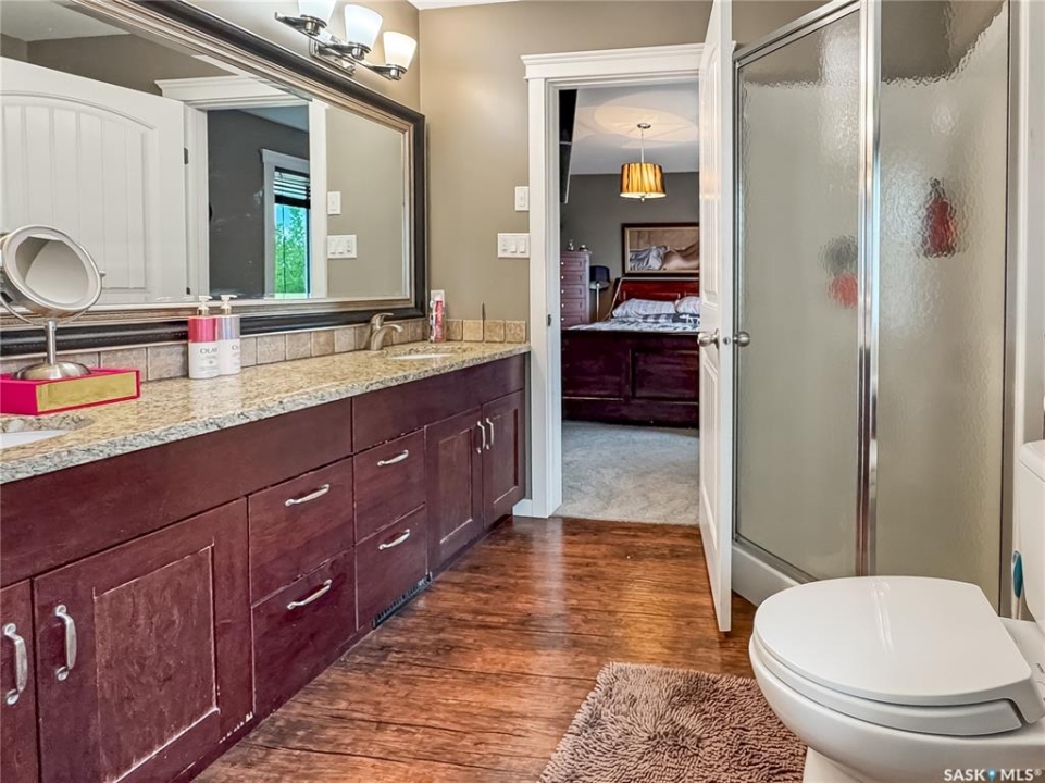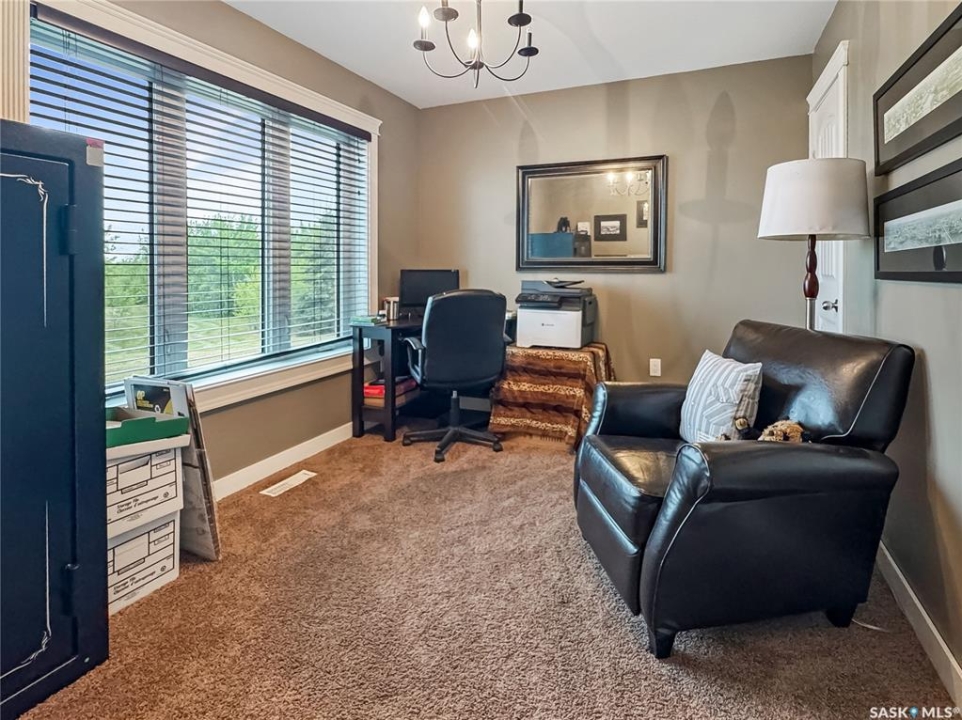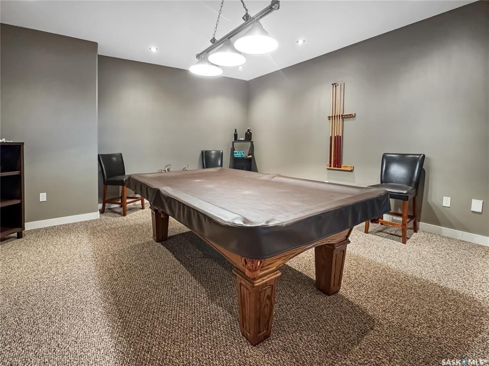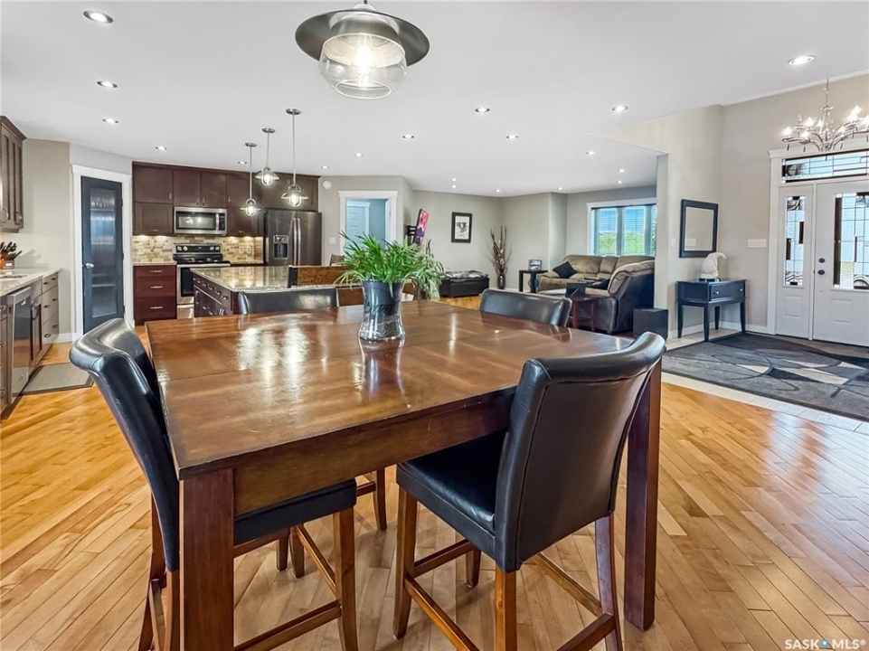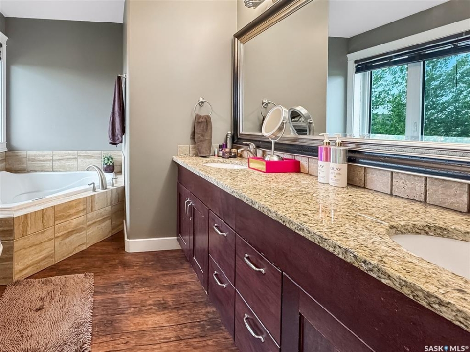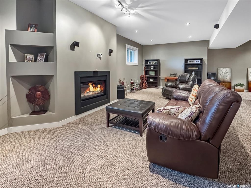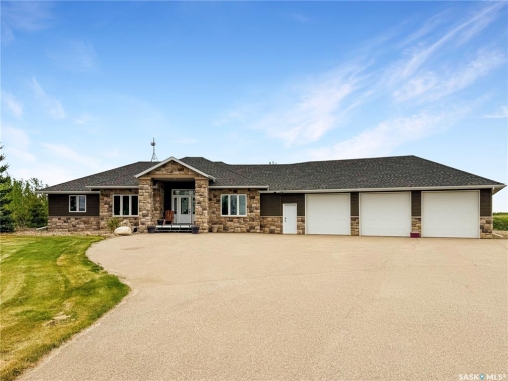 Tucked into the sought-after Battle Ridge Estates, this gorgeous 12.45-acre property offers the perfect mix of modern comfort and peaceful prairie living. From the moment you arrive, this home stands out. A paved driveway leads to a metal security gate, welcoming you into a beautifully landscaped yard equipped with over 100 underground sprinklers to keep everything lush and green. Inside, this spacious 5-bedroom bungalow is built to impress. The main level is constructed with 2x8 walls wrapped in 1.5 inches of Styrofoam insulation, delivering both efficiency and durability. Enjoy elegant finishes throughout including granite countertops, tile and hardwood flooring, and in-floor heat in the basement and garage as well as forced air natural gas furnace to accompany central air conditioning in the summer for the main floor. The heart of the home is the stunning kitchen featuring a massive granite island that flows seamlessly into the dining and living areas. Patio doors lead from the dining space to a large deck overlooking your private view of the natural Saskatchewan plains. The main floor includes three spacious bedrooms, and a luxurious primary suite with walk in closet, a Jacuzzi tub, tiled shower, and dual sinks. Downstairs, the fully finished basement features 9-foot ceilings, an expansive recreation area open to a cozy family room with a natural gas fireplace, two oversized bedrooms, a full bath, and another office or hobby space. The basement is built with 8-inch ICF walls, ensuring long-term strength and insulation. The triple attached garage adds even more value, boasting acid-stained in-floor heated concrete, plus a convenient bathroom—a rare find. There is a massive 40 x 40 pole shed for even more extras storage. Whether you're seeking space, peace, or a high-end acreage lifestyle, this property offers it all. Move-in ready and built for comfort—come experience the acreage life without giving up convenience. Call today to book your private showing.