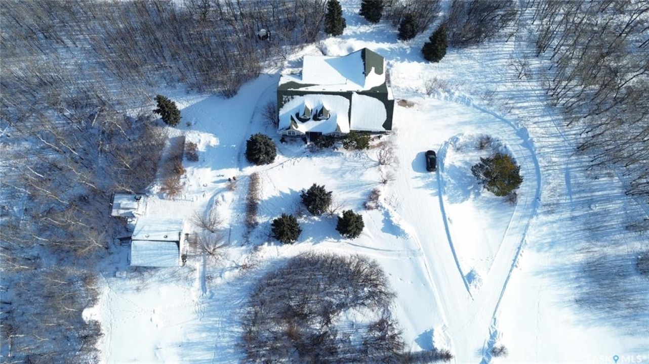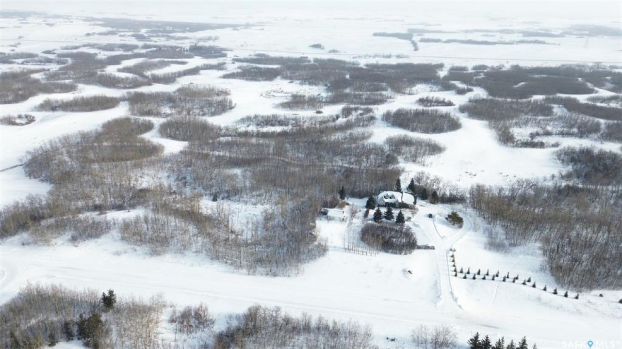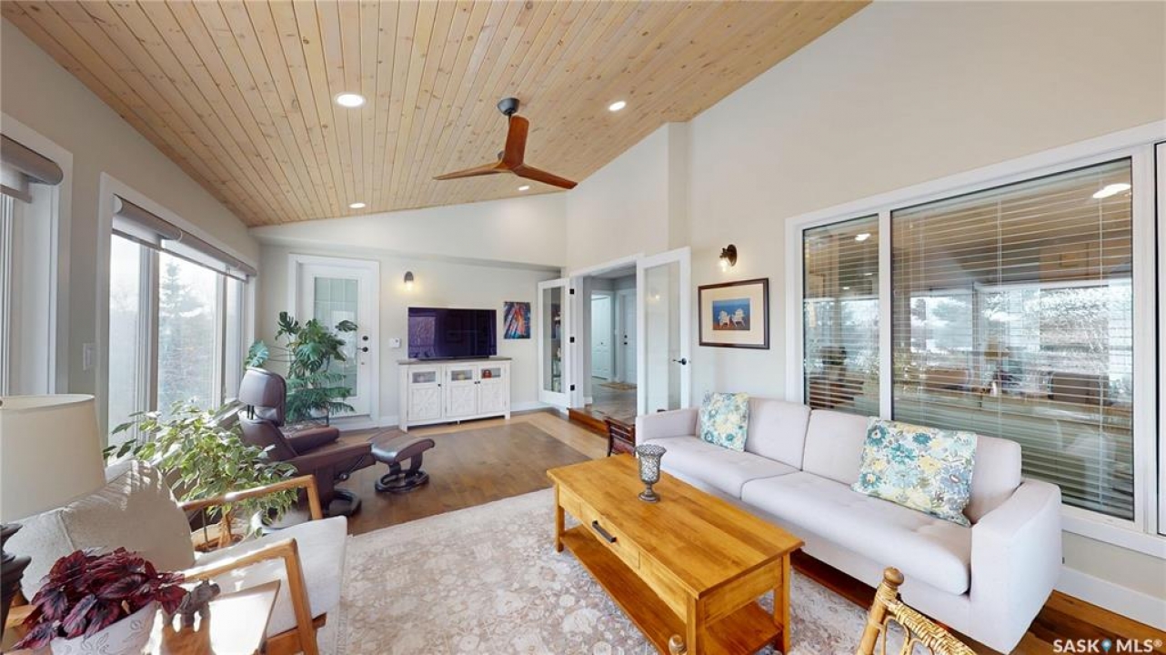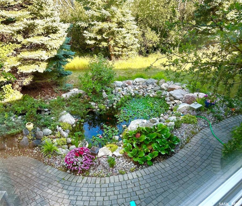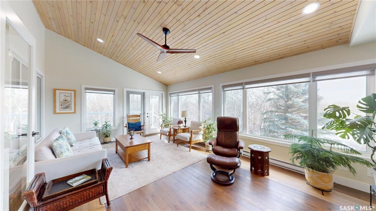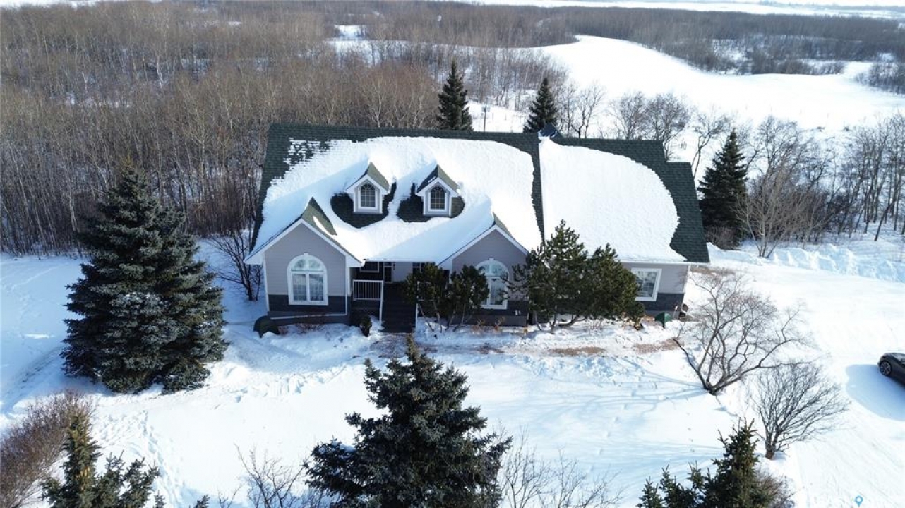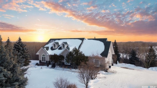Absolutely beautiful and large executive-quality walkout bungalow on a well-treed 10-acre yard only 10km east of Saskatoon. Please view the Matterport 3D virtual tour and floor plans in the listing. Definitely one of the best acreages you'll find, offering city water, a private park-like yard, and a stunning home with over 3600 square feet of living area. An archway connects the foyer to a spacious living room under soaring vaulted ceilings, where you can cozy up to a warm gas fireplace. A formal dining area with large windows and a gourmet kitchen with ample counter space flank the living room, perfect for entertaining while maintaining distinct spaces. The primary bedroom has a luxurious ensuite with a jetted tub and a walk-in closet. The main floor also includes a second bedroom, a full bath, an office that could be converted into another bedroom, laundry, and a 4-season sun room accessible from the primary bedroom and kitchen nook. The walkout basement with comfortable in-floor heat adds a 3rd bedroom and bathroom, a generously large family room with another gas fireplace, and a games room that could be modified to serve as an additional bedroom. An attached garage is fully insulated and finished with cabinets, and there's a heated 24x24 workshop. A massive paving stone patio is sheltered by the deck above, with a curved sidewalk nestled up to a fish pond. Over $100k spent on major renovations and improvements since 2021 by qualified trades using top-quality materials - pride of ownership is evident everywhere you look. Many gardens, fruit trees, and walking paths provide a peaceful setting, while high-end finishes like hardwood flooring and granite countertops inside the home will pamper owners with even the most discerning and cultivated tastes. Too many upgrades and features to mention, the list goes on and on - must be seen to be fully appreciated. Call now for your own private viewing!