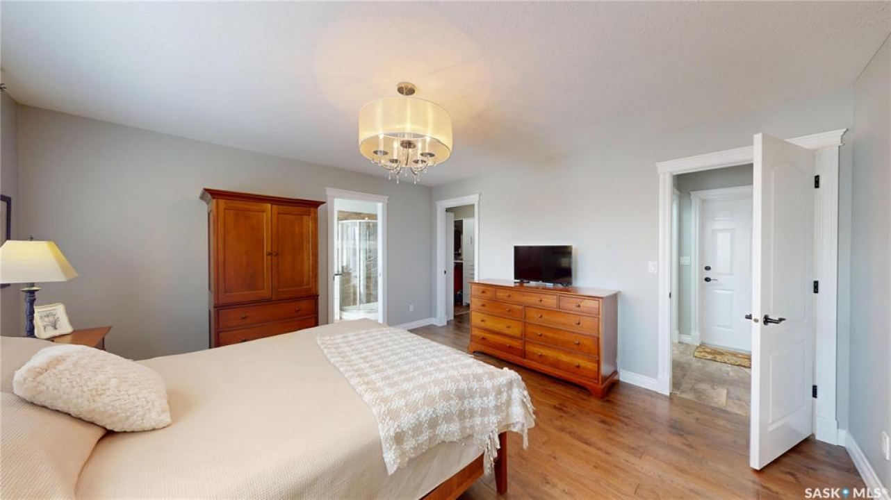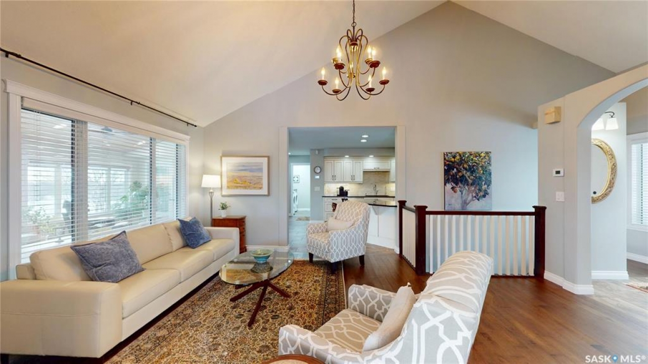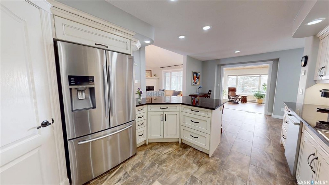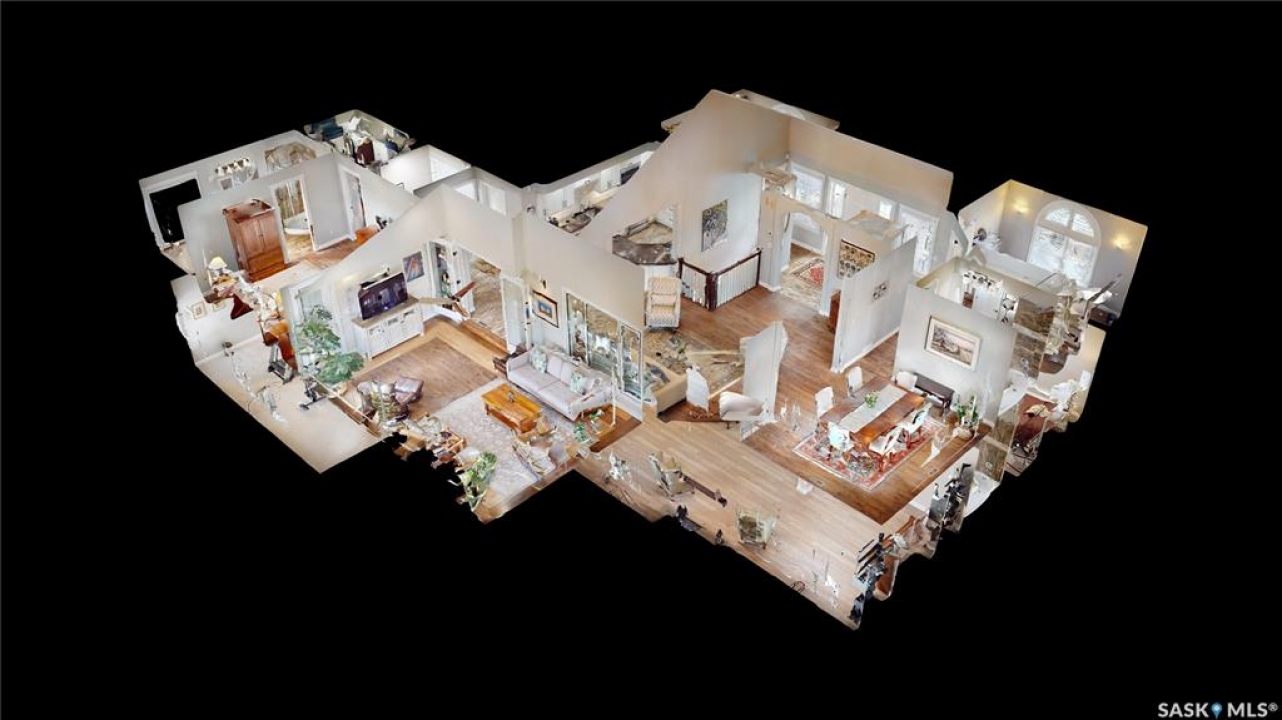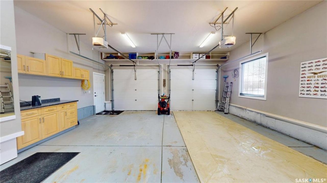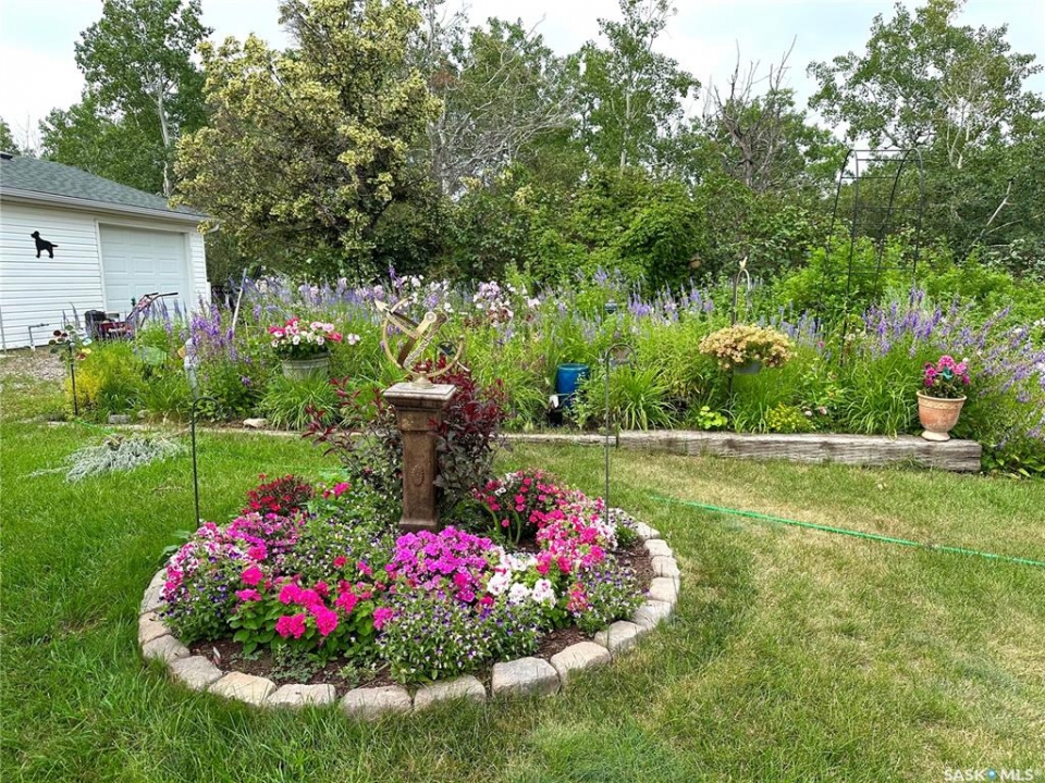 Absolutely beautiful and large executive-quality walkout bungalow on a well-treed 10-acre yard only 10km east of Saskatoon. Please view the Matterport 3D virtual tour and floor plans in the listing. Definitely one of the best acreages you'll find, offering city water, a private park-like yard, and a stunning home with over 3600 square feet of living area. An archway connects the foyer to a spacious living room under soaring vaulted ceilings, where you can cozy up to a warm gas fireplace. A formal dining area with large windows and a gourmet kitchen with ample counter space flank the living room, perfect for entertaining while maintaining distinct spaces. The primary bedroom has a luxurious ensuite with a jetted tub and a walk-in closet. The main floor also includes a second bedroom, a full bath, an office that could be converted into another bedroom, laundry, and a 4-season sun room accessible from the primary bedroom and kitchen nook. The walkout basement with comfortable in-floor heat adds a 3rd bedroom and bathroom, a generously large family room with another gas fireplace, and a games room that could be modified to serve as an additional bedroom. An attached garage is fully insulated and finished with cabinets, and there's a heated 24x24 workshop. A massive paving stone patio is sheltered by the deck above, with a curved sidewalk nestled up to a fish pond. Over $100k spent on major renovations and improvements since 2021 by qualified trades using top-quality materials - pride of ownership is evident everywhere you look. Many gardens, fruit trees, and walking paths provide a peaceful setting, while high-end finishes like hardwood flooring and granite countertops inside the home will pamper owners with even the most discerning and cultivated tastes. Too many upgrades and features to mention, the list goes on and on - must be seen to be fully appreciated. Call now for your own private viewing!