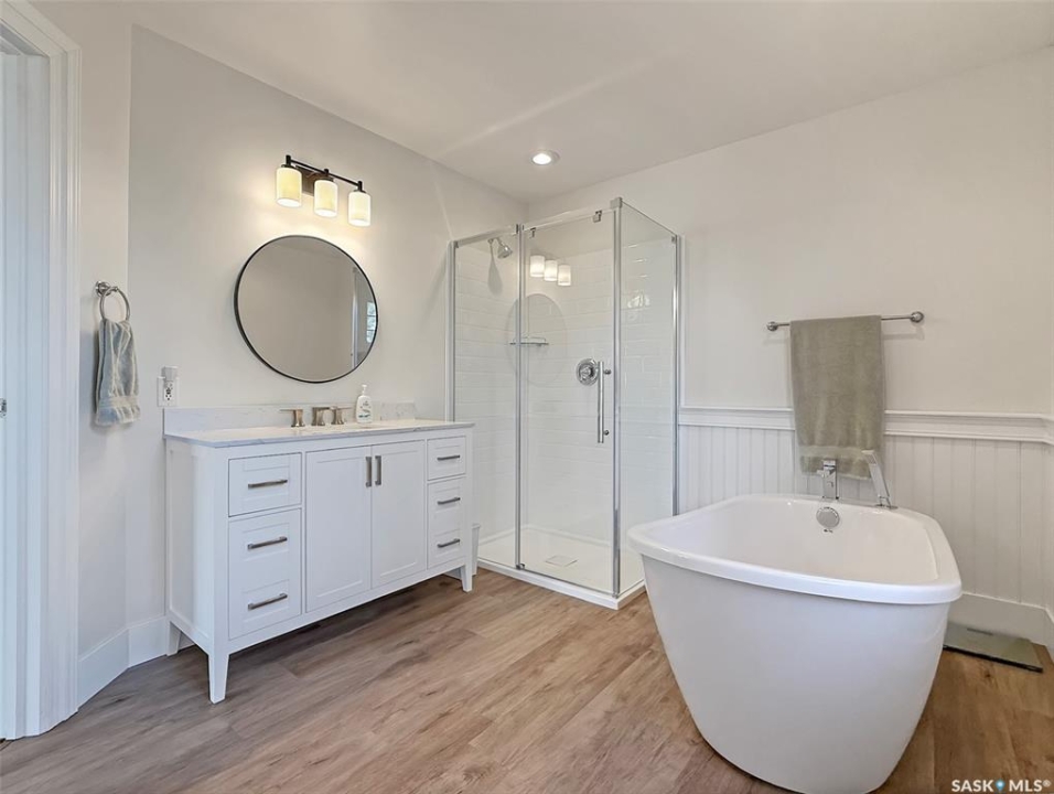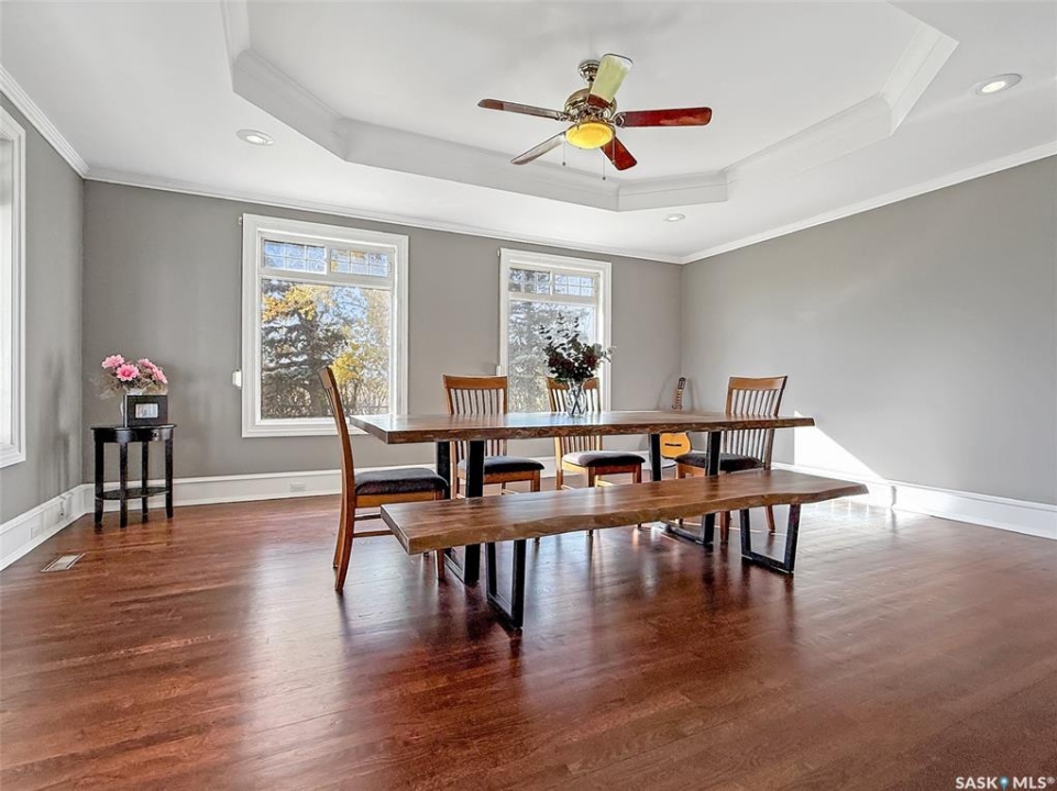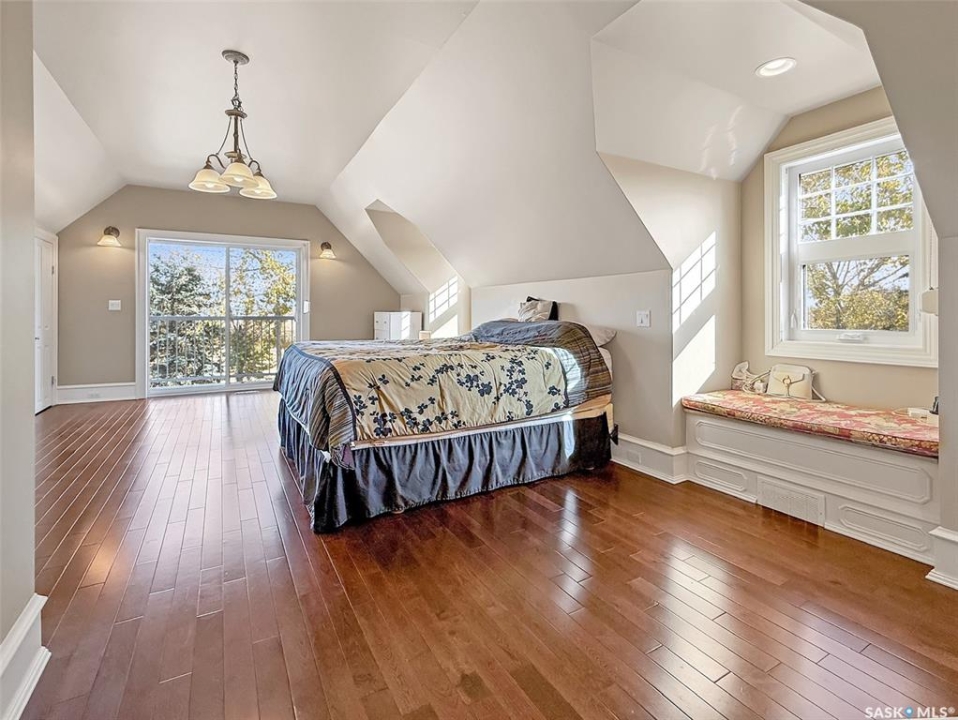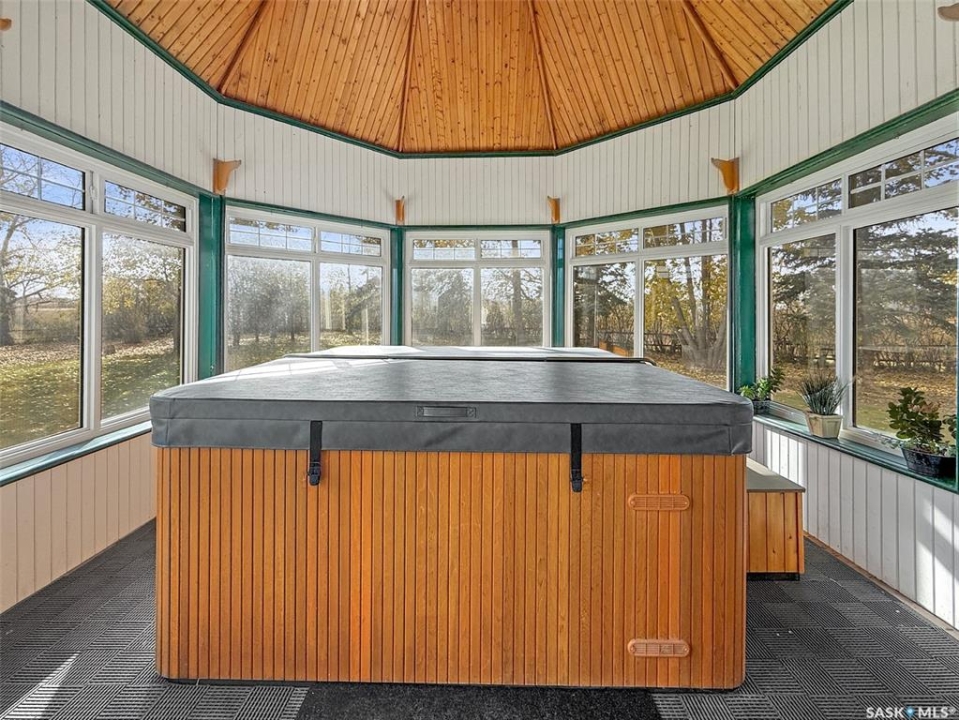 Discover an exquisite blend of privacy and convenience with this luxurious "in city" acreage. Nestled on the eastern edge of the city, this picturesque 1.5-acre property is enveloped by a lush shelter belt and bordered by a serene creek, offering stunning views. The craftsman-style home exudes charm with its elegant wraparound veranda, second-story dormers, and expansive windows that flood the interior with natural light.Upon entering, you'll be greeted by a graceful staircase leading to the second floor. To one side is a sitting room, the other side hosts a fully renovated eat-in kitchen and dining area. The kitchen features rich cabinetry, Stone countertops, a large island with seating, and SS appliances, all overlooking the beautiful yard. The main floor also includes a bedroom/office, a newly renovated bathroom, and a large laundry room that connects to the breezeway and a heated double car garage.The second floor boasts a charming bonus room with open-beam construction and a balcony overlooking the yard. Two additional bedrooms and a guest bath are located in the opposite wing. The master suite is a true highlight, featuring window seats, a closet spanning the entire wall, a private balcony, and a newly renovated five-piece en suite with a standalone tub and walk-in shower.The lower level offers a large family room, a fifth bedroom, a renovated three-piece bathroom, and an oversized utility/storage room. The home equipped with a zoned furnace(2024), two water heaters (one dedicated to floor heating in the garage and kitchen), central air and shingles installed(8 years ago). Additional updates include vinyl siding, triple-pane PVC windows, fresh paint throughout, and updated trim. The property is connected to city power and water, with a newly replaced septic tank and pump.Outside, the veranda leads to a fully enclosed hot tub room with panoramic windows. The property also includes an additional shop, a cozy fire pit area, and an additional back deck.