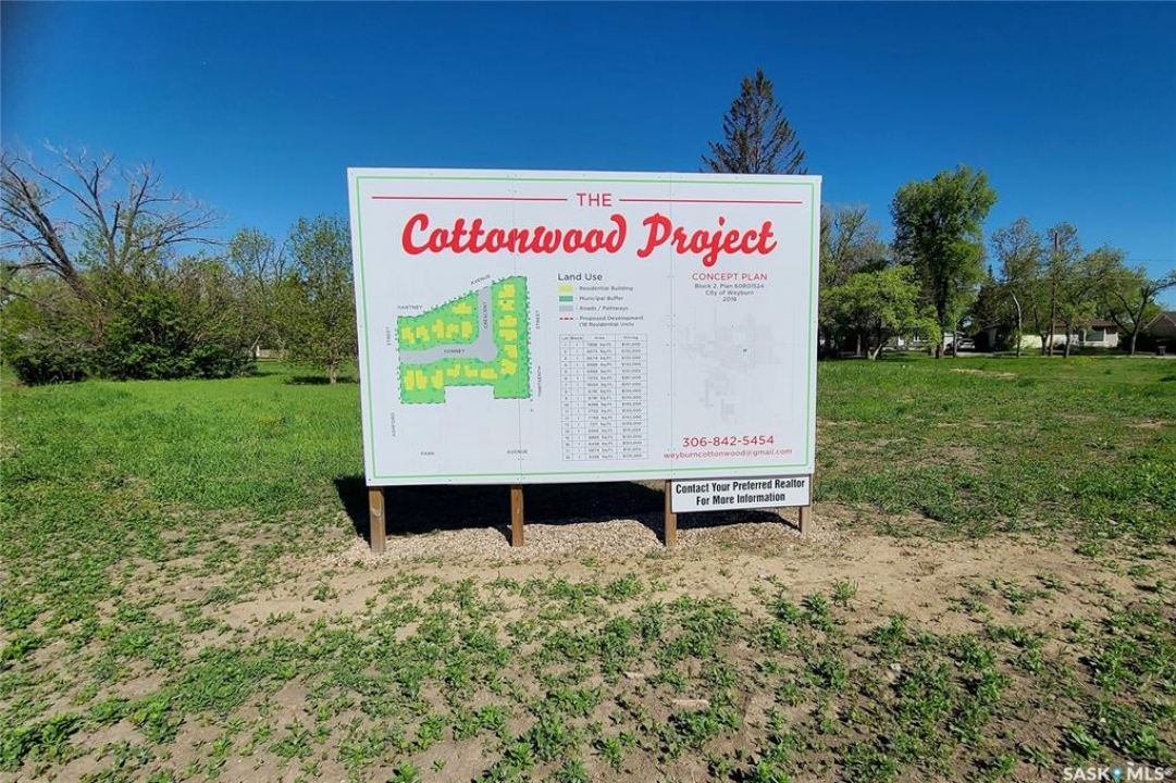 Welcome to Cottonwood Project — Weyburn's exciting, new residential neighborhood development! Nestled in a beautifully treed area in a developed residential location, the Cottonwood Project offers an opportunity previously unavailable in Weyburn - the chance to build your dream home among large, mature trees and be located within the heart of the city rather than restricted to a fringe area as with other residential lot developments. The Cottonwood Project is bordered by 13th St. on one side, Hartney Ave on another, and Ashford St. on the back. It is a cross from St. Michael School - Weyburn's only Catholic School (pre-K to Grade 9). Additionally, it is within easy walking distance to public schools, Jubilee Park( the central location for baseball, soccer,, tennis), the City leisure Centre and outdoor pool, and more. With a variety of sizes, there are lots for everyone. From pie-shaped lots, to elongated lots and standard rectangular options - you won't be disappointed. Kenney Crescent is a central L-Shaped road which services the neighborhood, creating that community feel. If you've been looking for that perfect place to build your family home but haven't been satisfied with the current options, check out the Cottonwood Project.