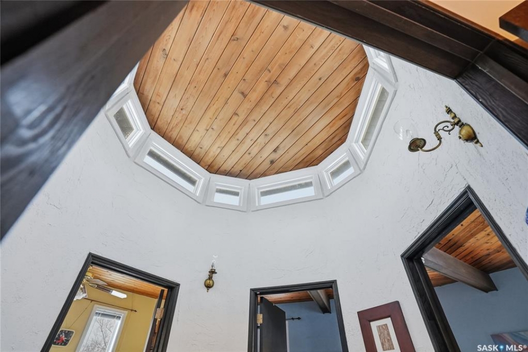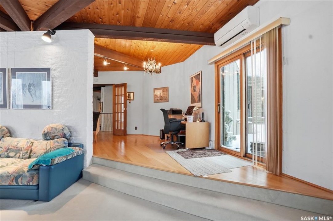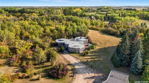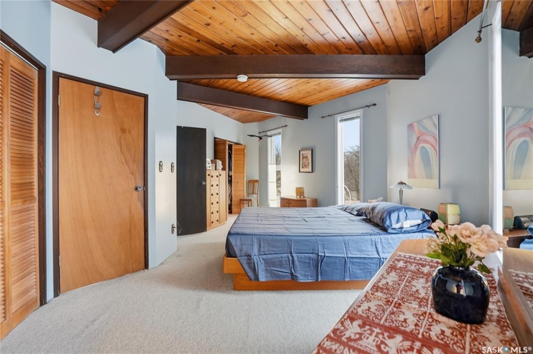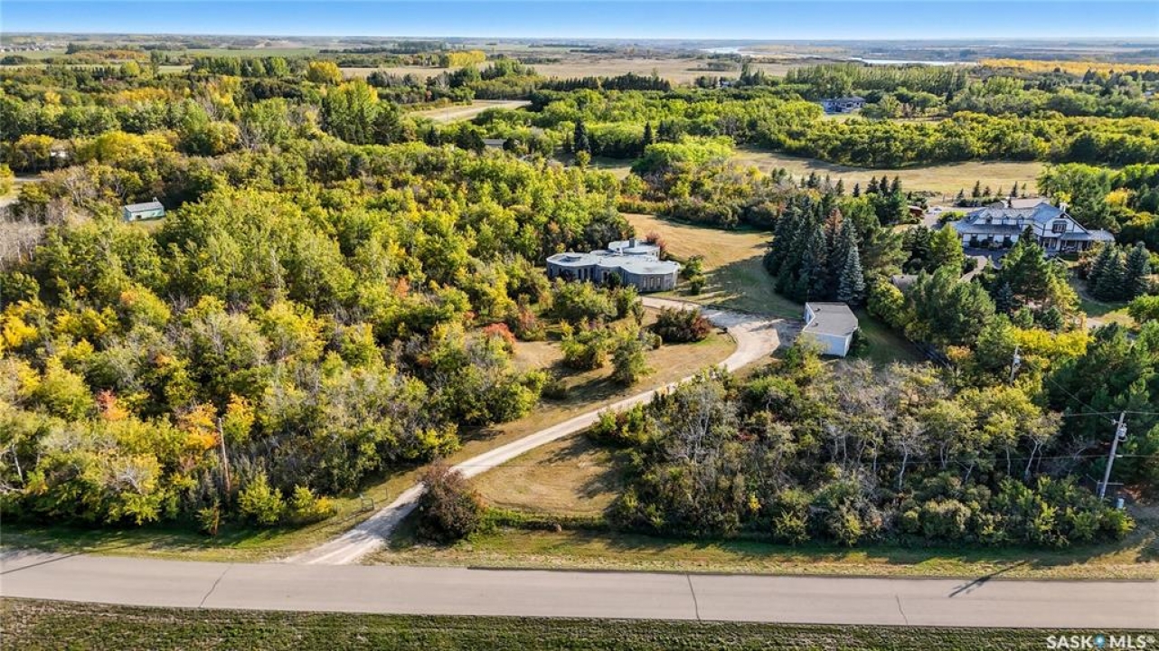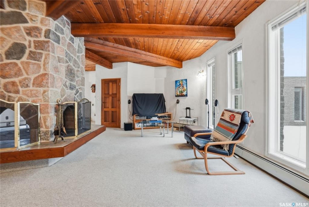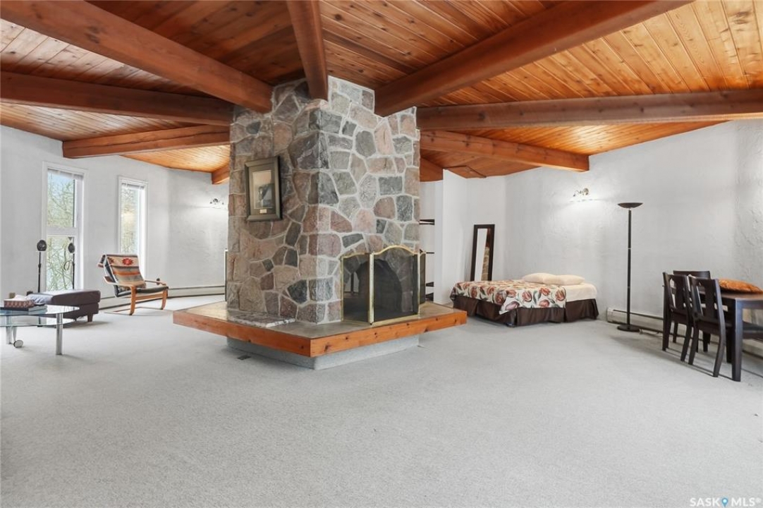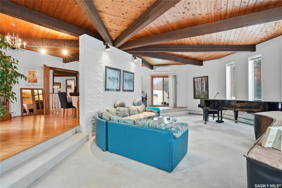 Located in prestigious Riverside Estates, this exceptional post-and-beam home offers a rare blend of architectural character, extensive upgrades, and a beautifully preserved natural setting. The mature, treed lot is rich with Saskatoon berry bushes and chokecherries, creating a private, vibrant landscape with a true acreage feel. This incredibly unique layout features multiple wings and flexible living spaces, ideal for families, entertaining, or working from home. The 3-bedroom, 2-bathroom design showcases soaring 9–11 foot ceilings, a dramatic five-sided stone fireplace, a sunken living room, and a chef's kitchen built for both everyday living and hosting. This home truly must be seen to be appreciated. Major upgrades provide exceptional efficiency and peace of mind. The roof has been replaced with a durable membrane system and enhanced insulation for superior energy performance. All 24 windows have been upgraded to triple-pane units with a lifetime warranty. A premium four-zone ductless air conditioning and heat-exchange system allows for customized comfort throughout the home. Additional highlights include an on-demand hot water system, dual ovens, and a dedicated well for landscape irrigation — ideal for maintaining the mature grounds and natural vegetation. Ideally located just 15 minutes from Saskatoon International Airport, approximately 2 km from Riverside Country Club and Chief Whitecap Park, and only 5 km from Saskatoon Golf & Country Club, this property offers an exceptional balance of privacy, nature, and convenience. A rare opportunity to own a thoughtfully upgraded home in one of the area's most desirable acreage communities.