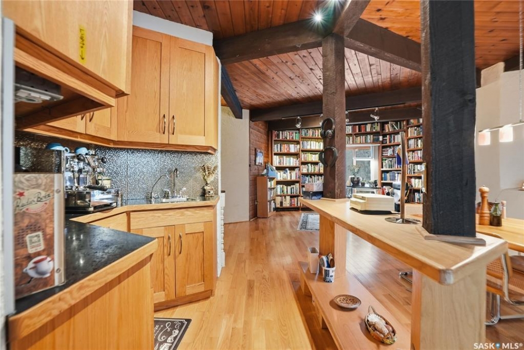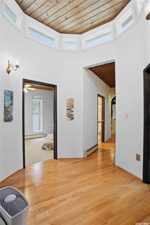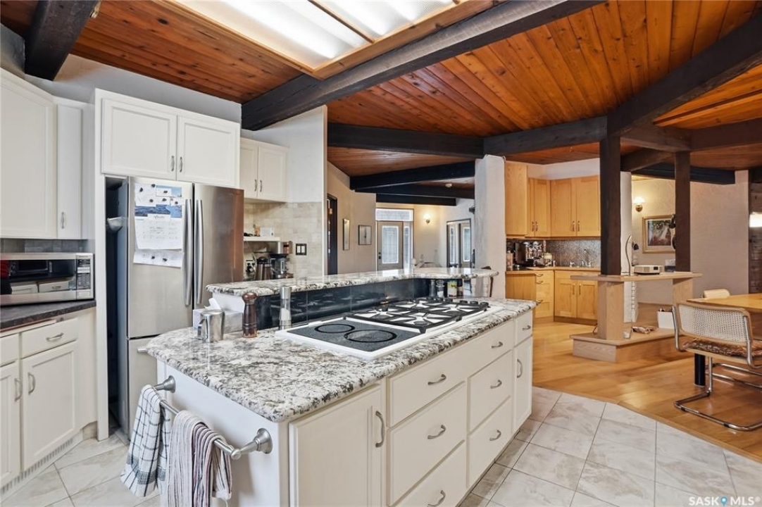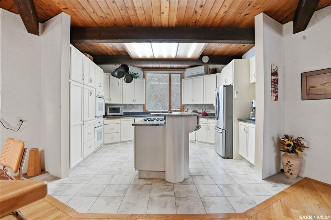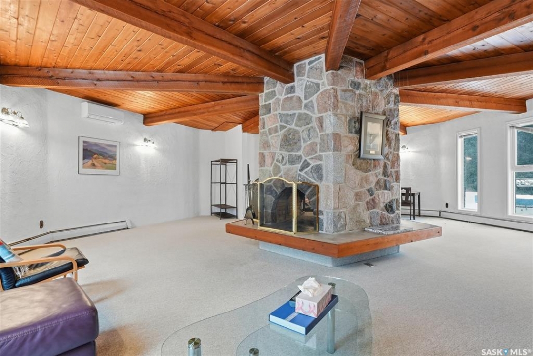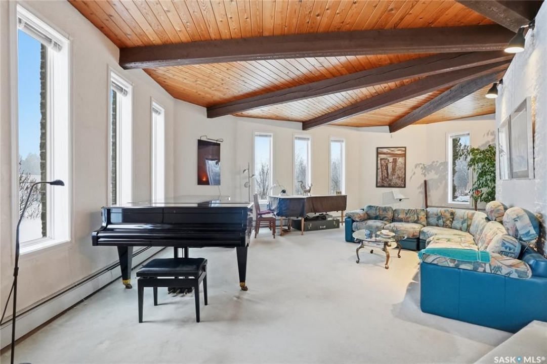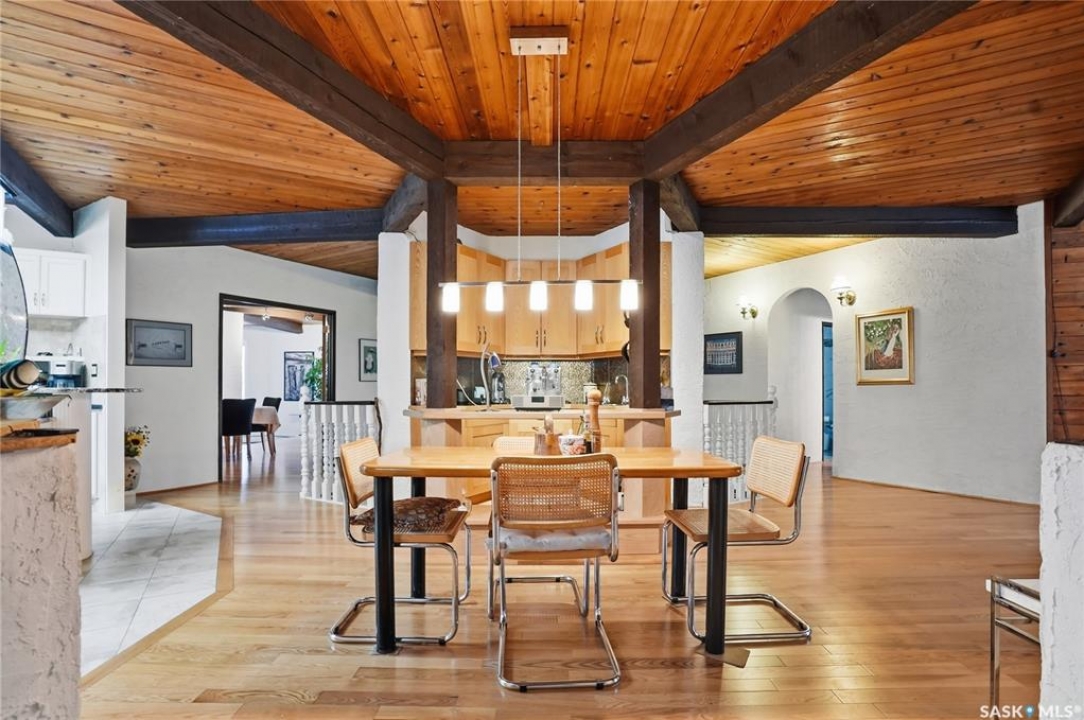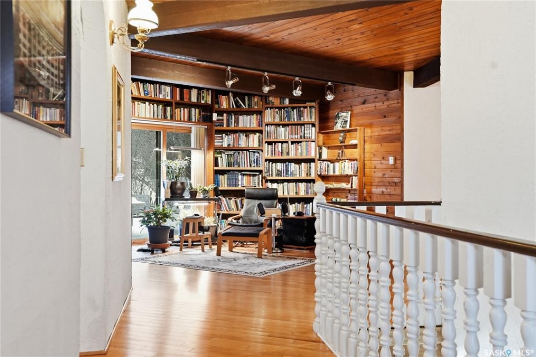 Located in prestigious Riverside Estates, this exceptional post-and-beam home offers a rare blend of architectural character, extensive upgrades, and a beautifully preserved natural setting. The mature, treed lot is rich with Saskatoon berry bushes and chokecherries, creating a private, vibrant landscape with a true acreage feel. This incredibly unique layout features multiple wings and flexible living spaces, ideal for families, entertaining, or working from home. The 3-bedroom, 2-bathroom design showcases soaring 9–11 foot ceilings, a dramatic five-sided stone fireplace, a sunken living room, and a chef's kitchen built for both everyday living and hosting. This home truly must be seen to be appreciated. Major upgrades provide exceptional efficiency and peace of mind. The roof has been replaced with a durable membrane system and enhanced insulation for superior energy performance. All 24 windows have been upgraded to triple-pane units with a lifetime warranty. A premium four-zone ductless air conditioning and heat-exchange system allows for customized comfort throughout the home. Additional highlights include an on-demand hot water system, dual ovens, and a dedicated well for landscape irrigation — ideal for maintaining the mature grounds and natural vegetation. Ideally located just 15 minutes from Saskatoon International Airport, approximately 2 km from Riverside Country Club and Chief Whitecap Park, and only 5 km from Saskatoon Golf & Country Club, this property offers an exceptional balance of privacy, nature, and convenience. A rare opportunity to own a thoughtfully upgraded home in one of the area's most desirable acreage communities.